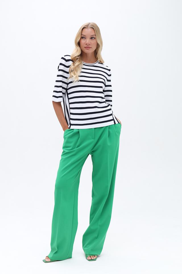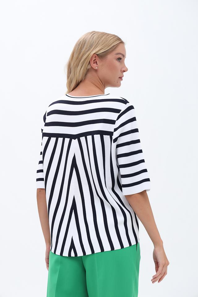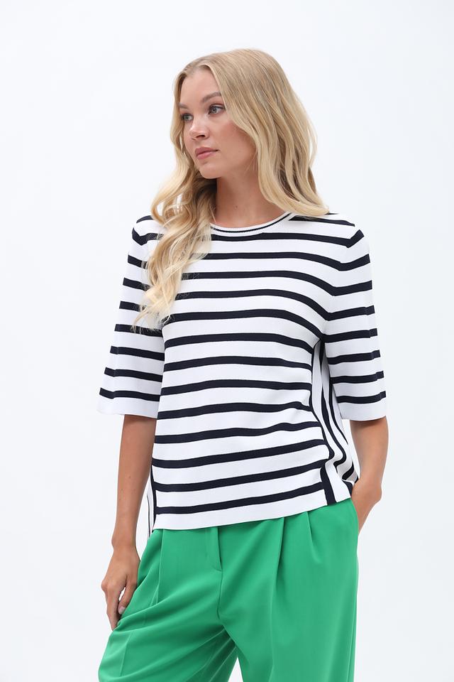 Женский пуловер Oui черного и белого цвета с ярким геометричным принтом в виде полос. Модель с короткими рукавами и округлым вырезом горловины станет отличным дополнением к вашему гардеробу. Состав: вискоза 65%, полиамид 35%