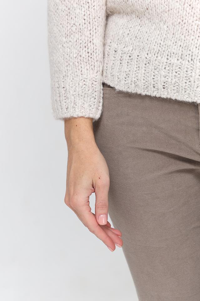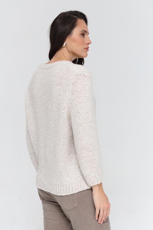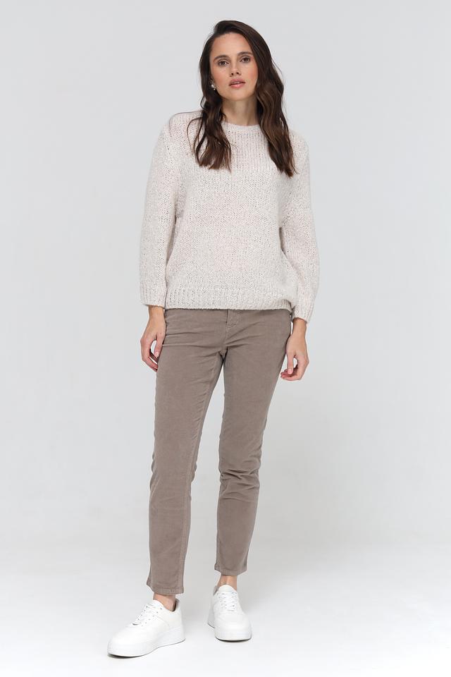 Состав пряжи включает 58% полиакрил, 20% шерсть, 12% полиамид и 10% мохер, что обеспечивает тепло, легкость и долговечность изделия. Бежевый цвет пуловера легко сочетается с различными элементами гардероба, позволяя создавать разнообразные образы.