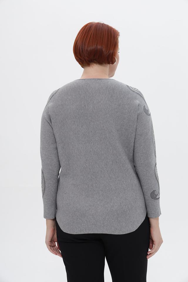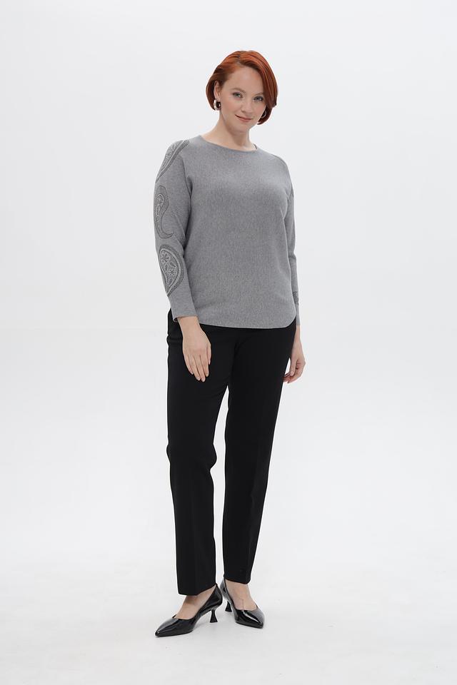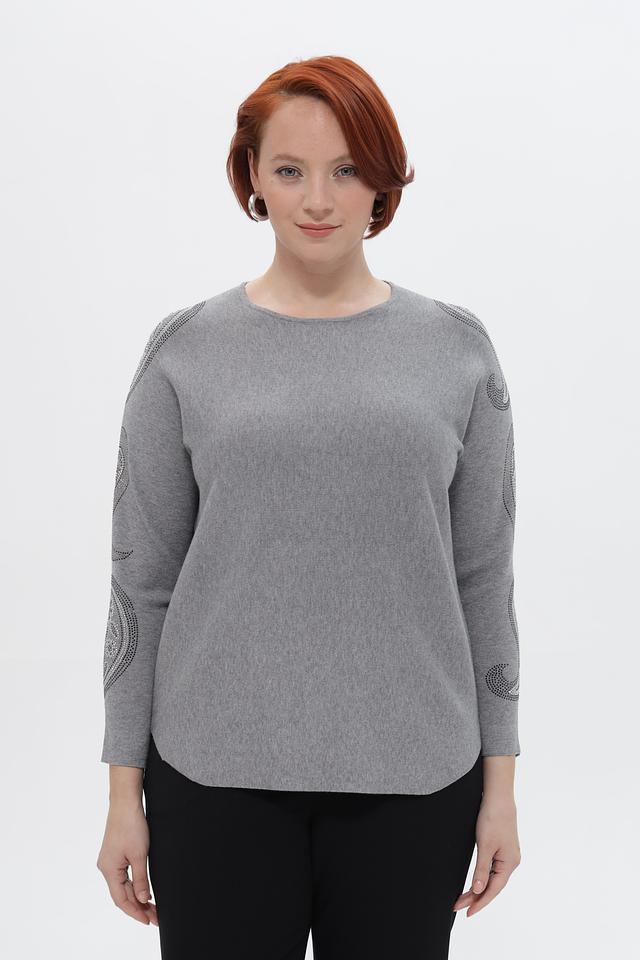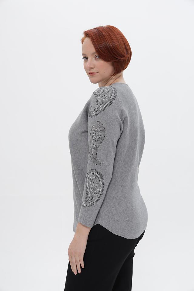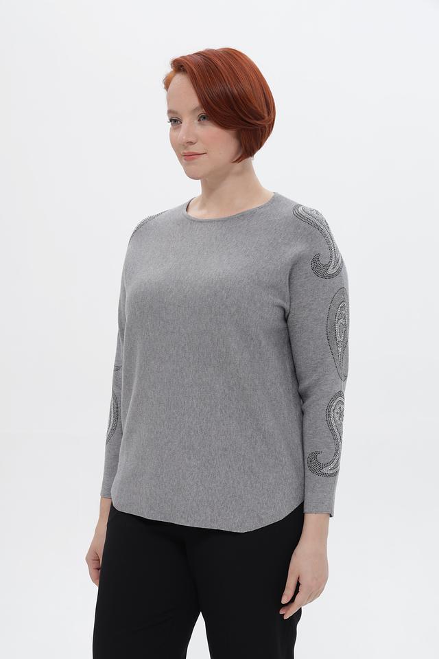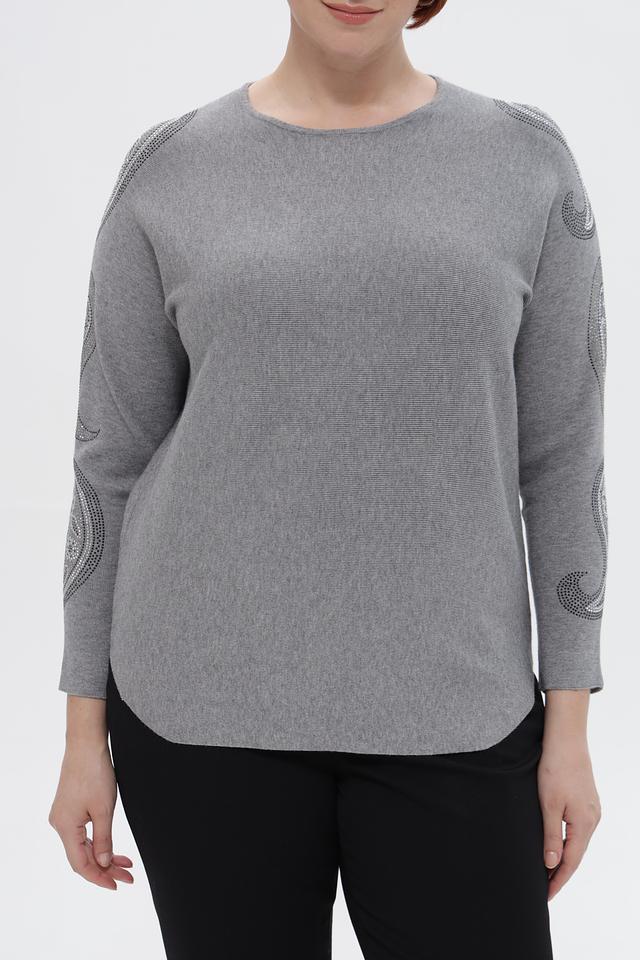 Серый пуловер Passioni с округлым вырезом и декоративными элементами в виде узора на рукавах. Изготовлен из мягкой вискозы с добавлением полиамида и полиэстера для комфорта и долговечности. Состав: вискоза 65%, полиамид 20%, полиэстер 15%