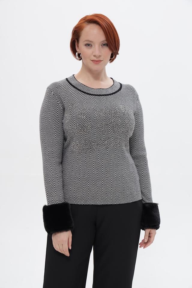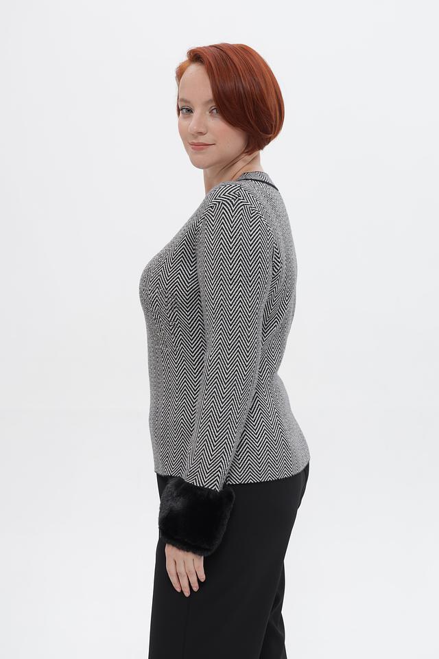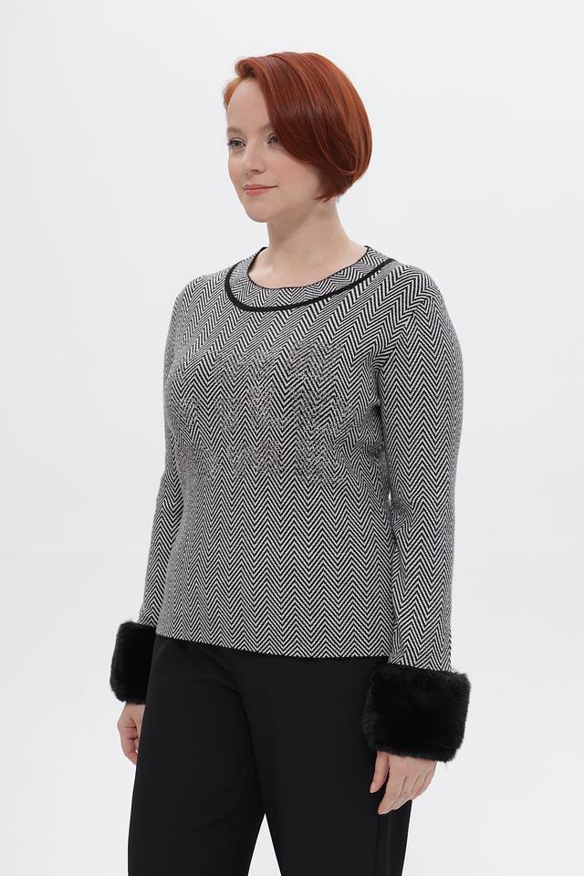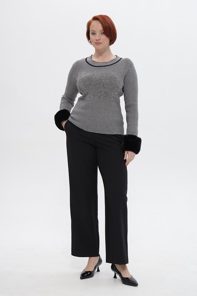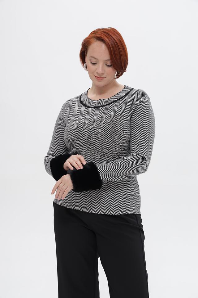 Пуловер имеет классический крой с округлым вырезом горловины и длинными рукавами. Особый акцент в этой модели — манжеты из мягкого искусственного меха чёрного цвета, которые придают образу роскошь и элегантность.