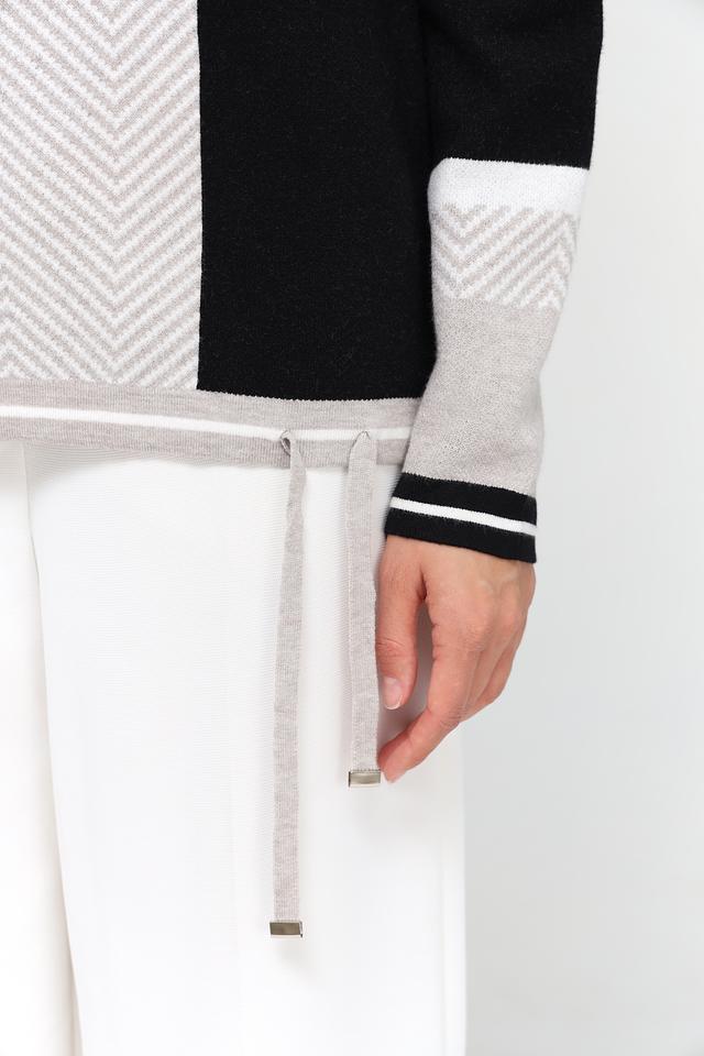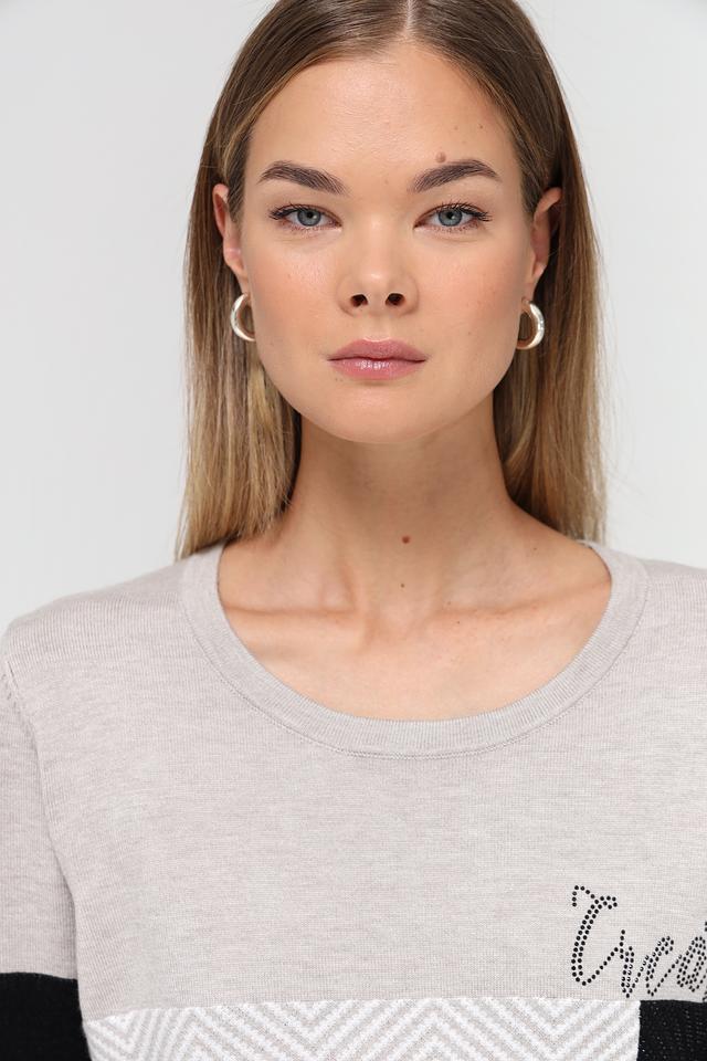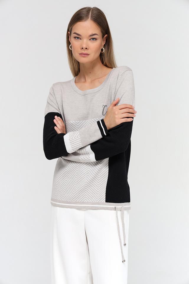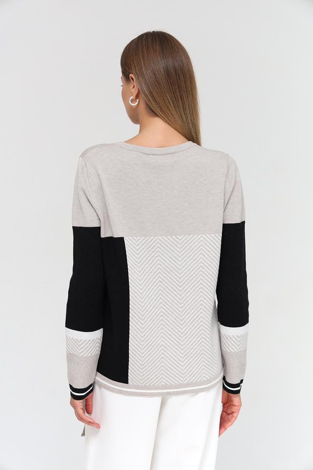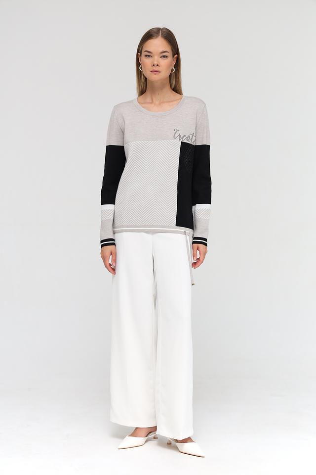 Пуловер имеет свободный крой, круглый вырез горловины и длинные рукава. Дизайн модели выполнен в сочетании серого цвета с чёрными вставками и геометрическим узором в виде елочки. На груди расположен декоративный элемент с надписью "Create", выполненной из блестящих букв.