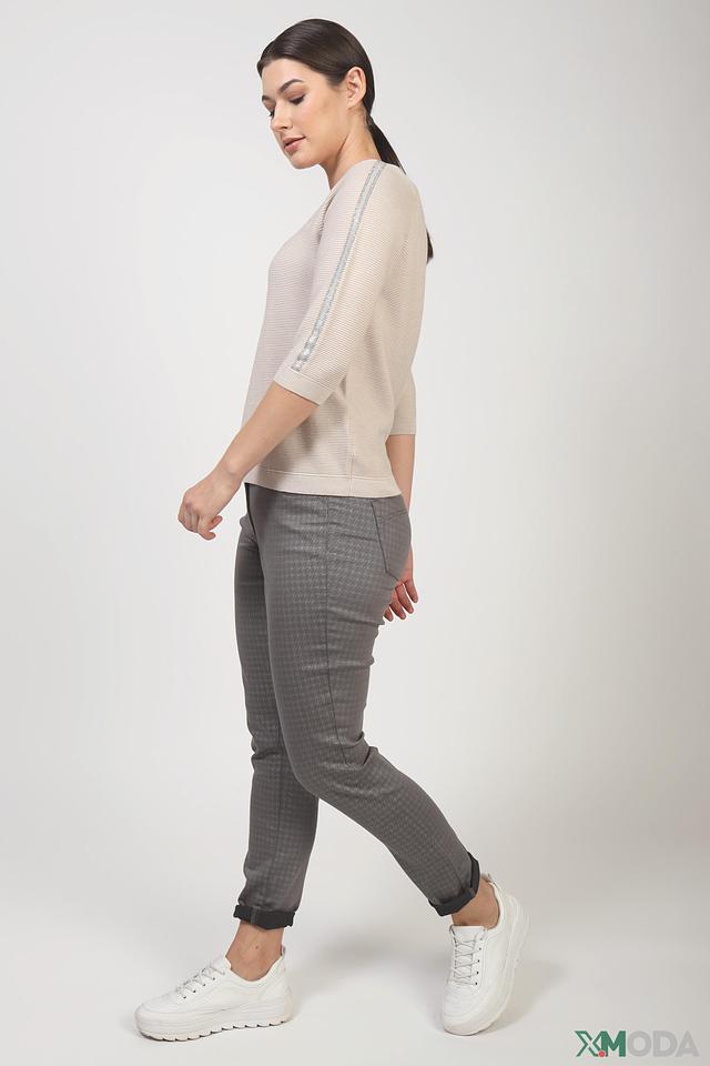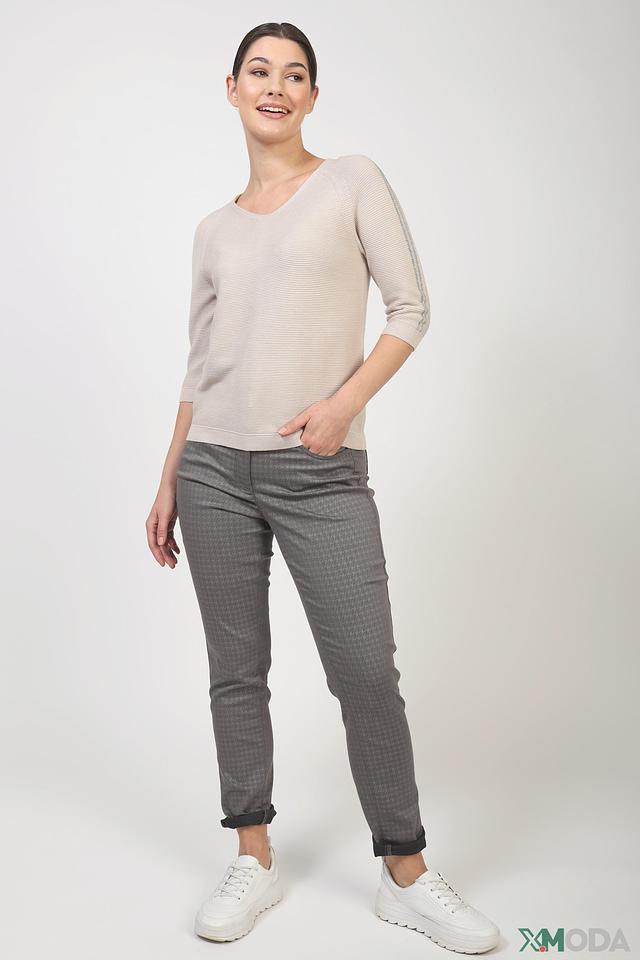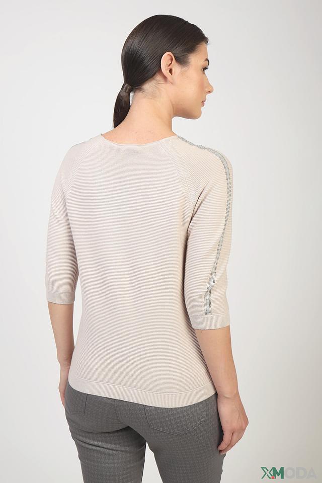 Пуловер имеет V-образный вырез горловины и короткие рукава. Оригинальную деталь добавляет полоска на рукавах, выполненная в светло-сером цвете. Текстура вязки – рельефная, что придает изделию дополнительный объем и интересную фактуру.