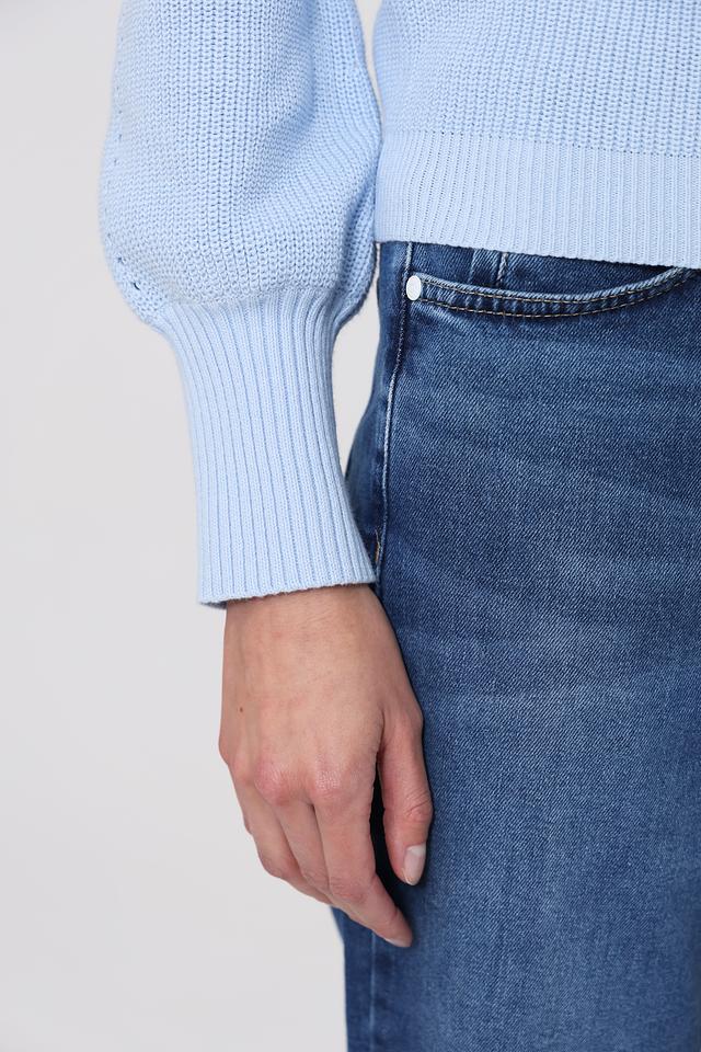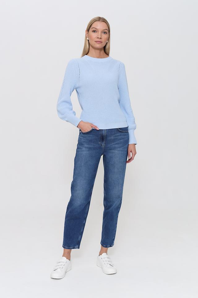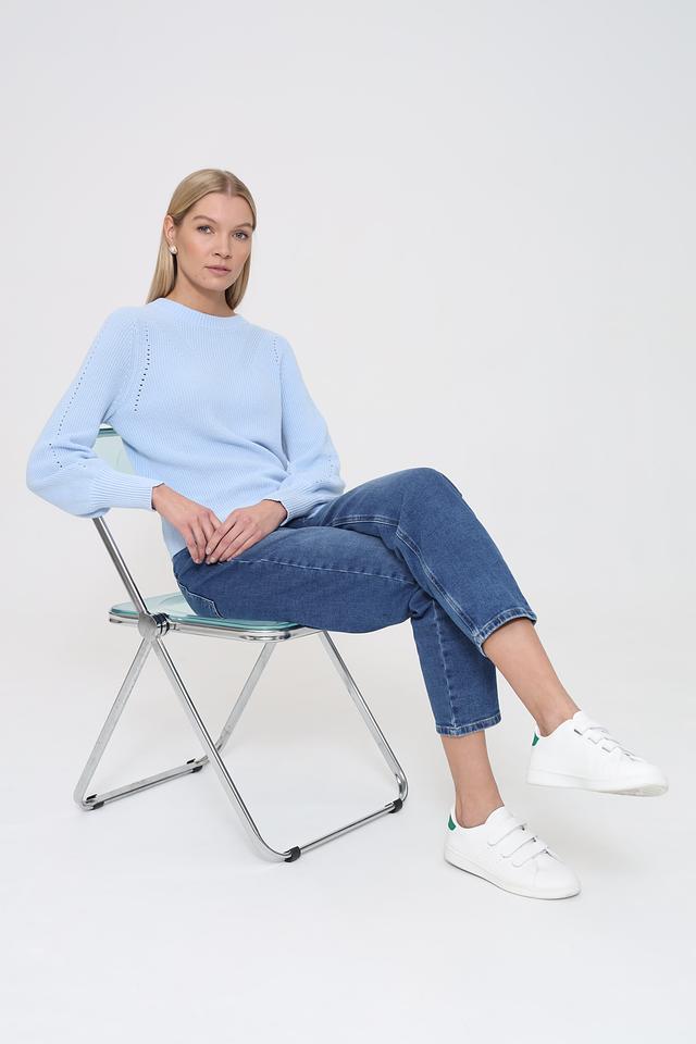 Пуловер имеет нежный голубой цвет и классический крой с круглым вырезом горловины. Особый шарм изделию придаёт ажурный узор, расположенный на плечах и рукавах, который добавляет ему изысканности и оригинальности.