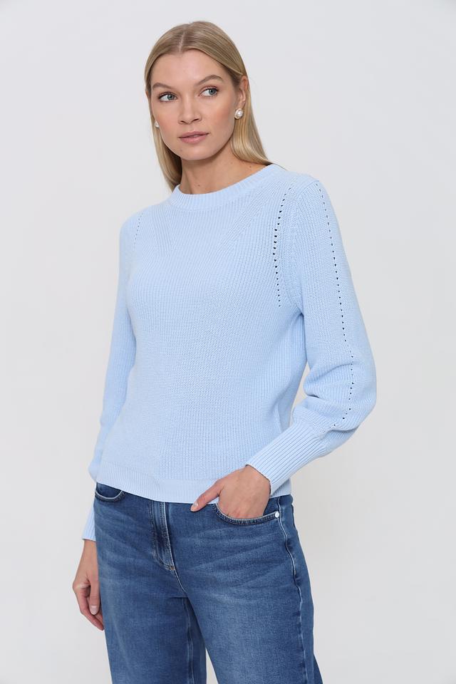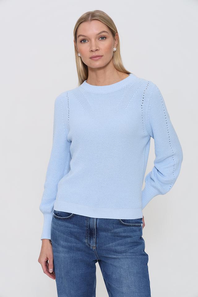 Женский пуловер Pezzo голубого цвета выполнен из мягкого хлопка и украшен ажурным узором на плечах и рукавах. Эта модель станет отличным дополнением к вашему базовому гардеробу. Состав: хлопок 100%