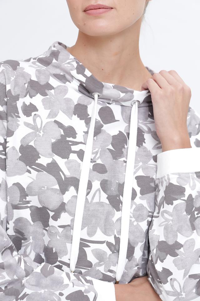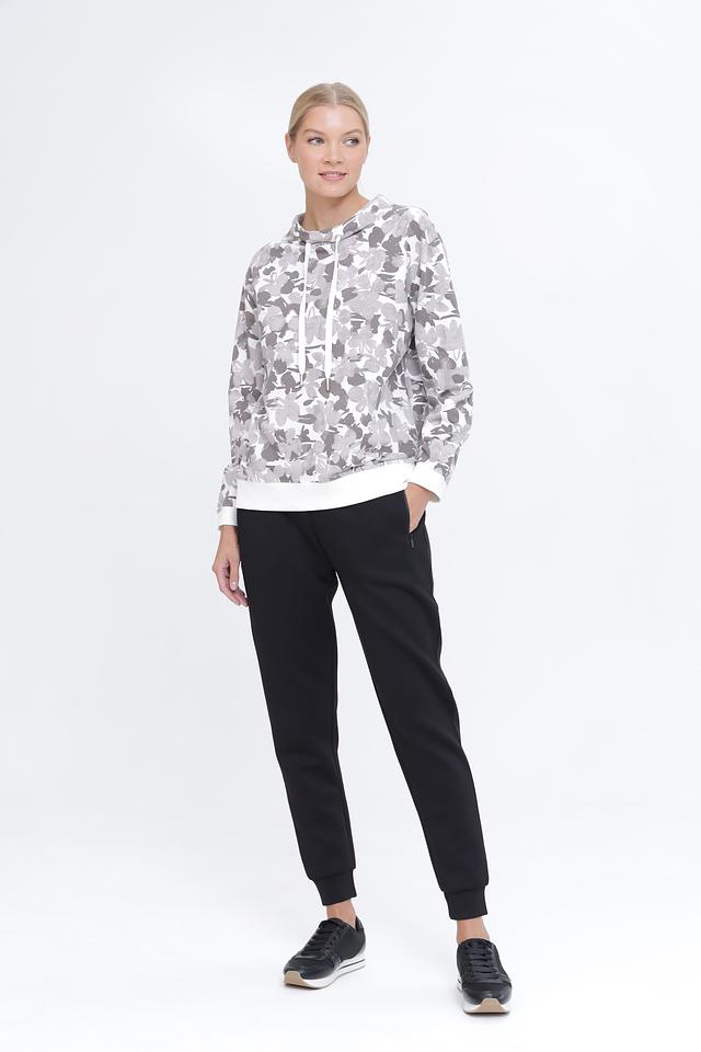 Пуловер имеет удобный капюшон с белыми шнурками, которые добавляют динамики дизайну. Вырез горловины оформлен белой рибаной, которая гармонично сочетается с принтом и манжетами рукавов.