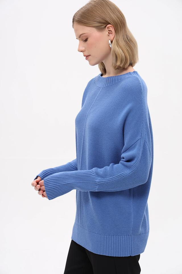 Пуловер имеет свободный крой, обеспечивающий свободу движений и комфорт в носке. Выразительный вертикальный шов придает изделию современный и оригинальный вид. Вязаная текстура делает пуловер уютным и тёплым.