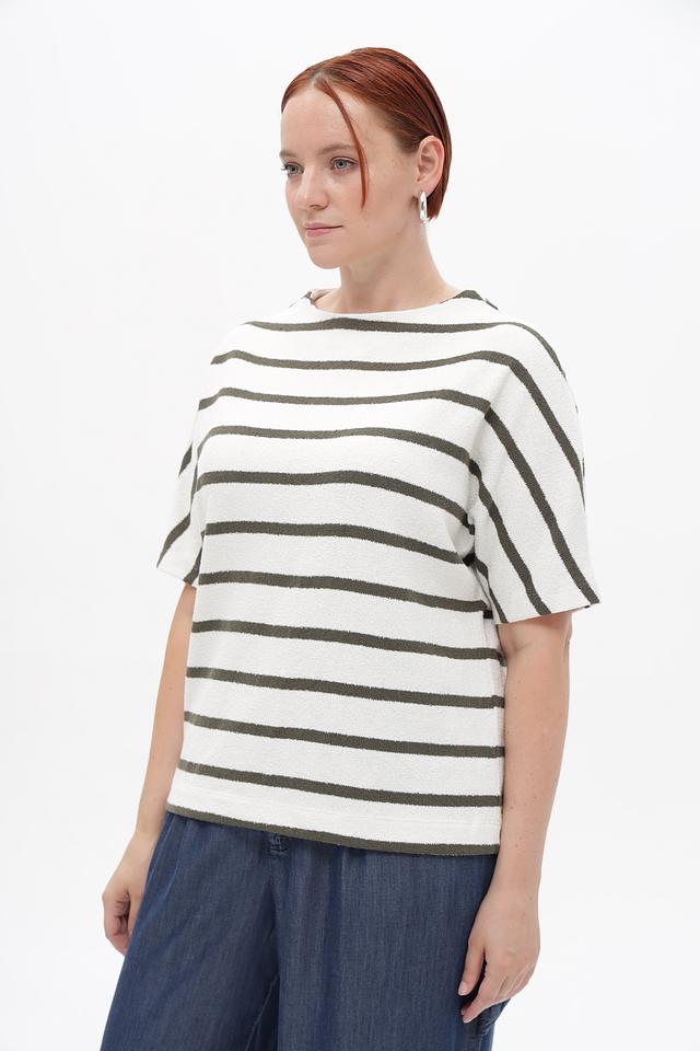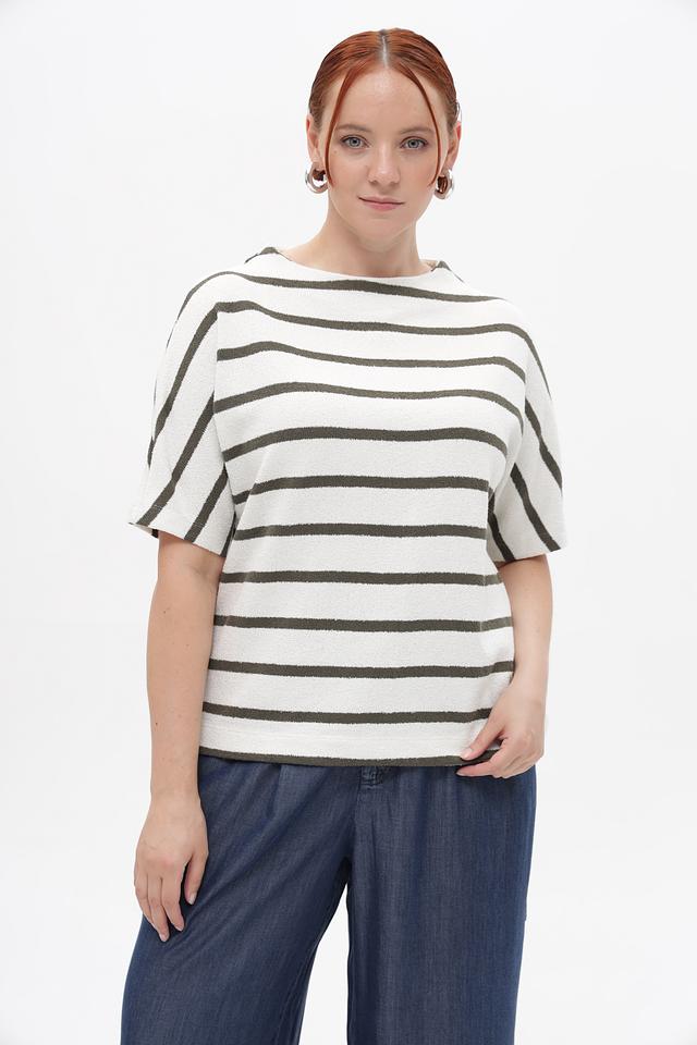 Женский пуловер Rabe collection белого и оливкового цвета с коротким рукавом и горизонтальной полоской. Модель выполнена из мягкого и приятного к телу трикотажа, идеально подходит для создания повседневных образов. Состав: хлопок 50%, модал 30%, полиэстер 20%