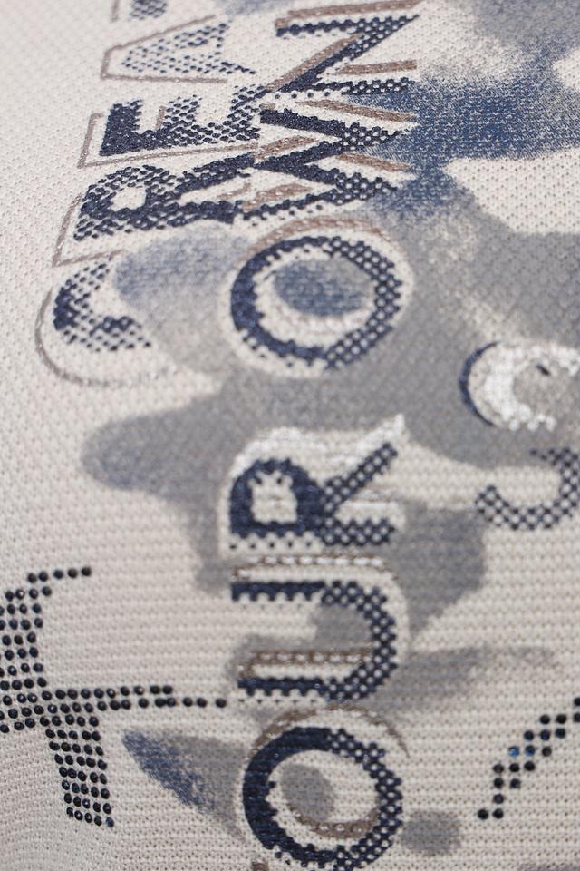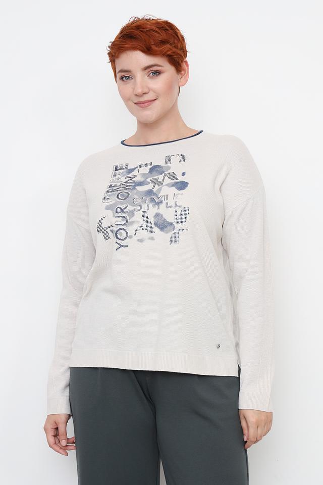 Этот стильный пуловер от Rabe collection станет отличным дополнением к вашему гардеробу. Он выполнен в нежном бежевом цвете и украшен ярким принтом с надписями и графическими элементами.