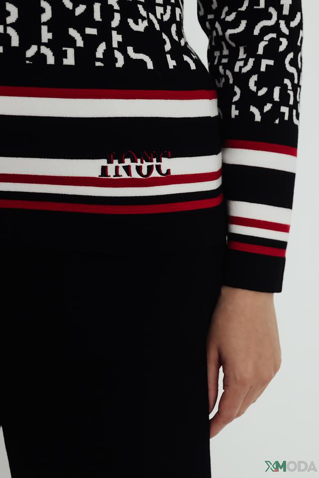 Пуловер имеет чёрный цвет с ярким принтом, который придает ему индивидуальность. Контрастная полоса на рукавах и по низу изделия добавляет динамики и завершенности образу. Круглый вырез горловины делает модель универсальной и подходящей для различных стилей.