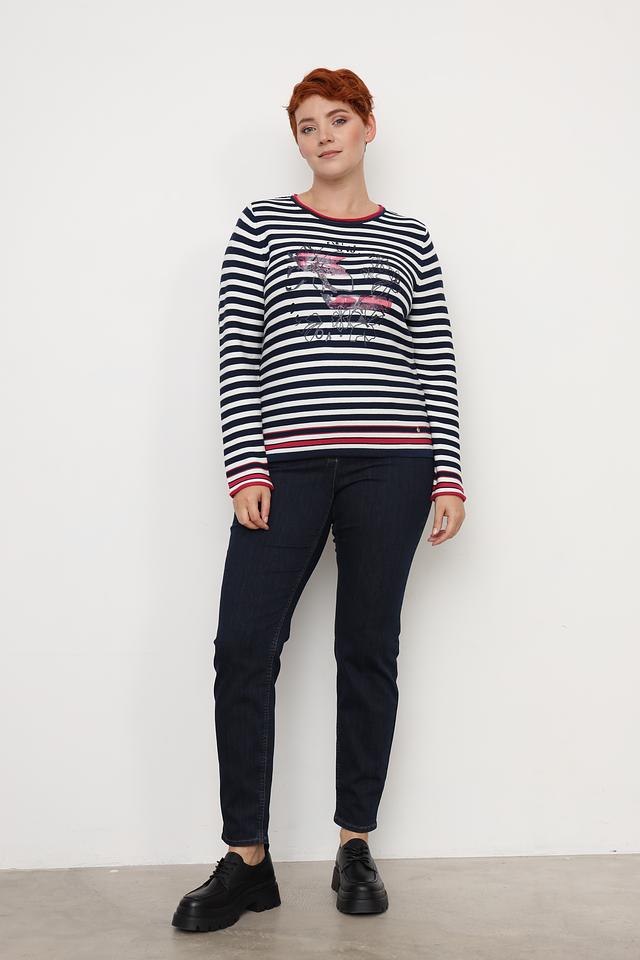Женский пуловер Rabe collection синего цвета с полоской и ярким принтом. Модель выполнена из мягкого и приятного к телу сочетания хлопка и полиакрила, обеспечивающего комфорт в носке. Состав: хлопок 50%, полиакрил 50%