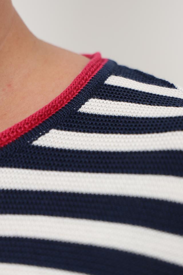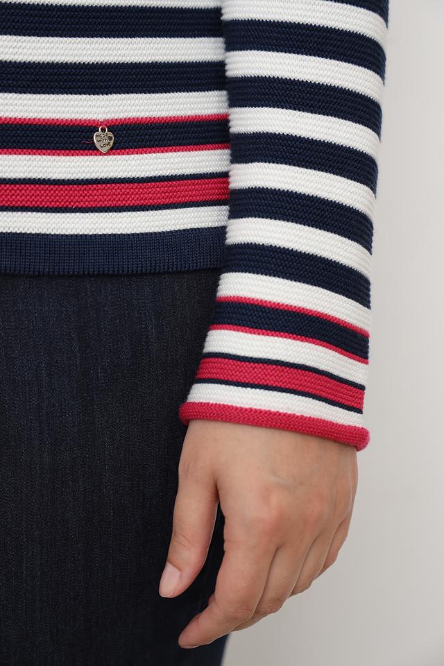 Модель имеет удобный круглый вырез горловины, отделанный тонкой красной полоской, и длинные рукава с манжетами, также оформленными красной полоской. Пуловер имеет слегка приталенный силуэт, который подчеркнет достоинства фигуры.