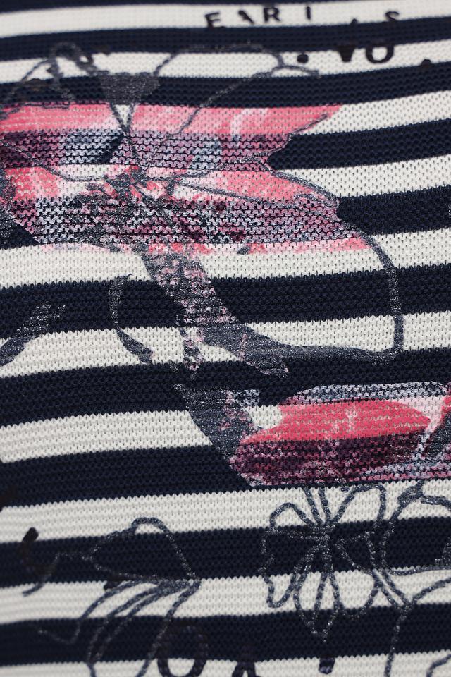 Этот стильный пуловер от Rabe collection станет отличным дополнением к вашему гардеробу. Пуловер выполнен в классической полосатой расцветке – сочетание темно-синего и белого цветов. Декорирован ярким принтом с изображением птиц и растений, добавляющим образу оригинальности.
