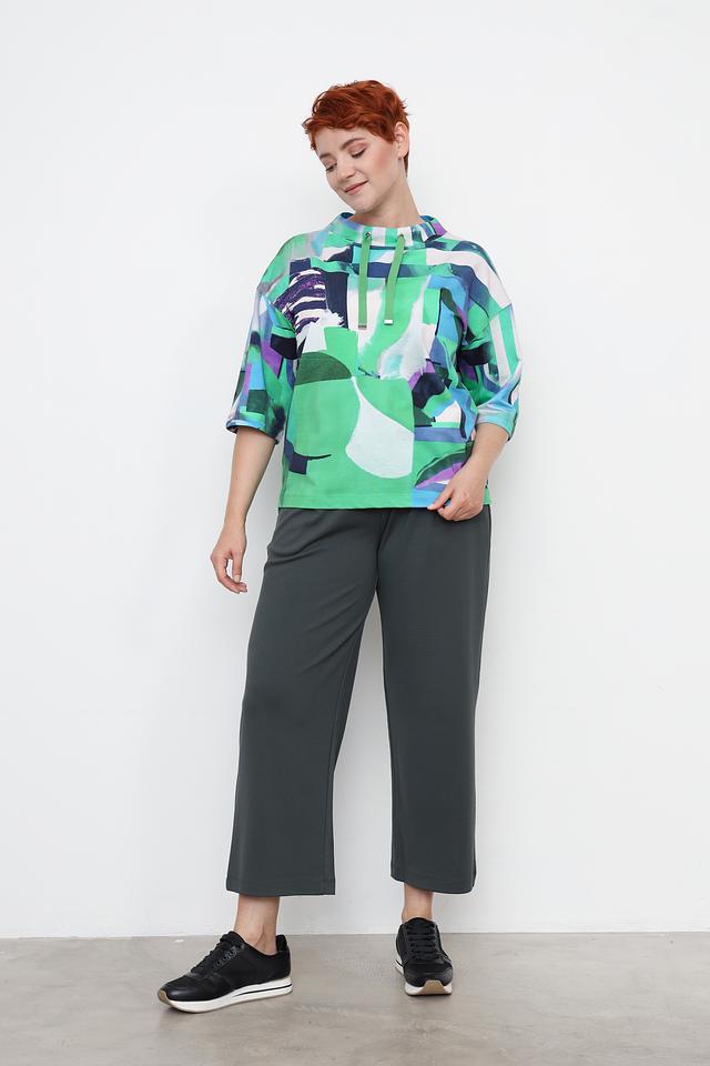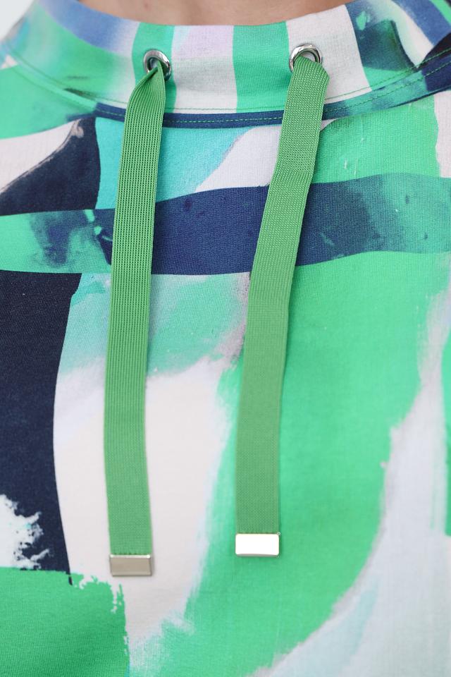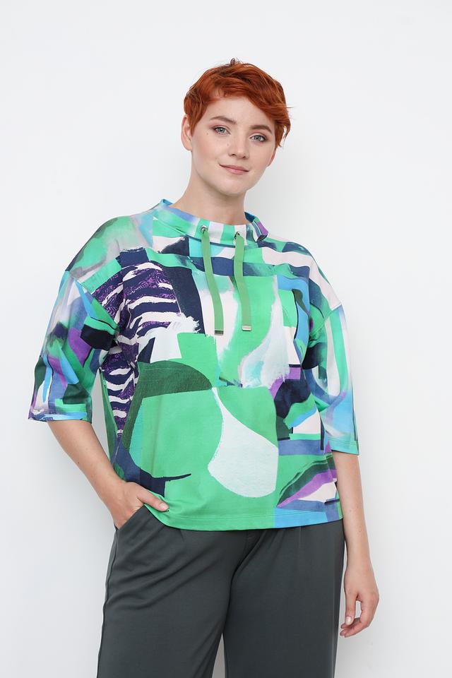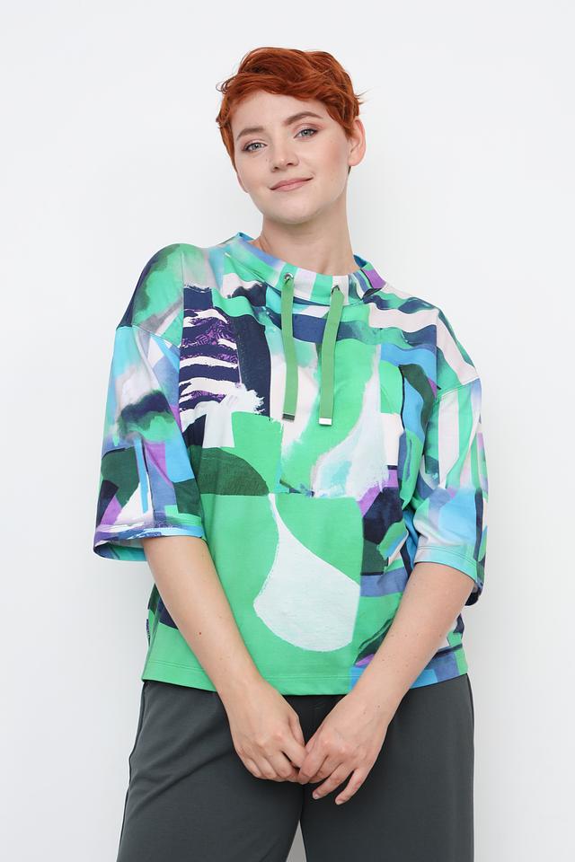 Женский пуловер Rabe collection зеленого цвета с ярким абстрактным принтом и короткими рукавами. Модель с округлым вырезом горловины и небольшим капюшоном, дополненным шнурками. Изготовлен из мягкого и приятного к телу трикотажа. Состав: хлопок 60%, вискоза 35%, эластан 5%