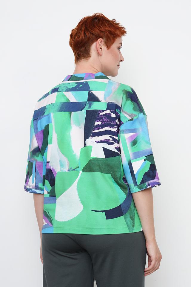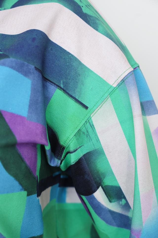 Этот стильный пуловер от Rabe collection станет ярким акцентом вашего образа. Модель выполнена в насыщенном зеленом цвете и украшена оригинальным абстрактным принтом, сочетающим в себе оттенки синего, фиолетового и белого.