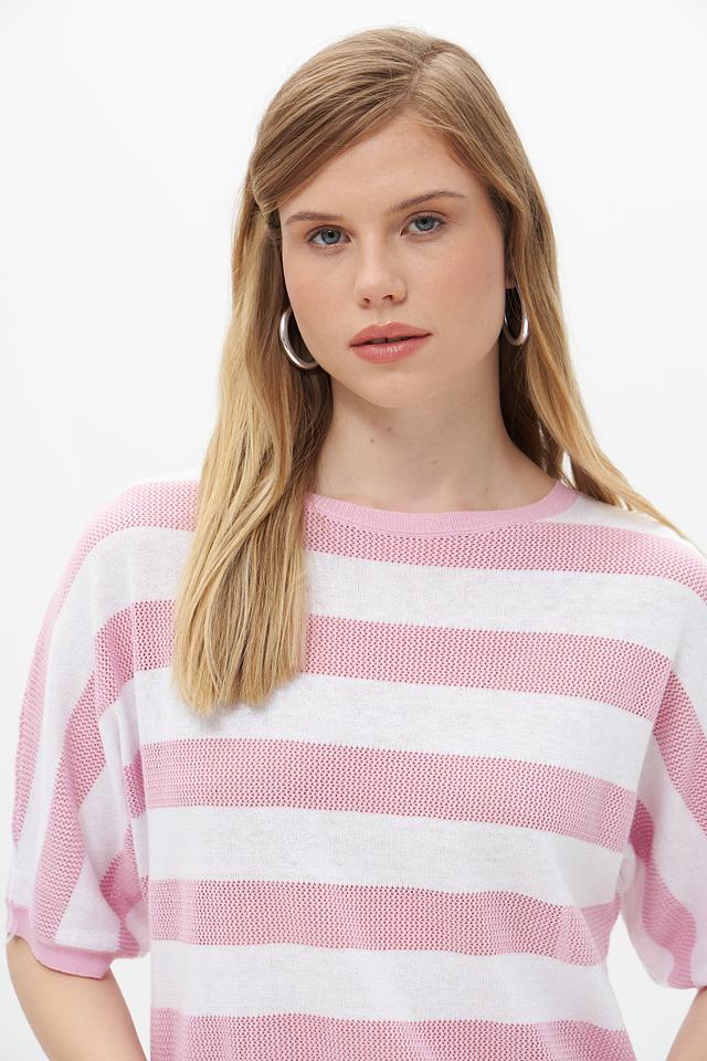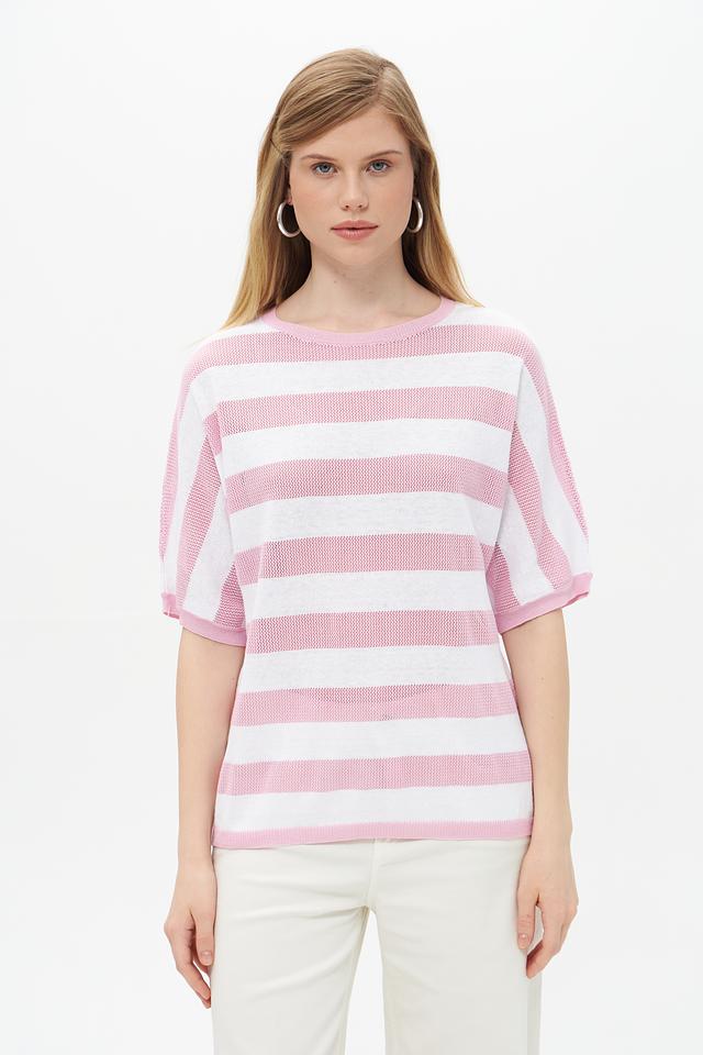 Пуловер имеет прямой, слегка свободный крой, который обеспечивает комфортную посадку по фигуре. Короткие рукава делают его идеальным выбором для теплой погоды, а круглый вырез горловины подчеркивает элегантность силуэта.