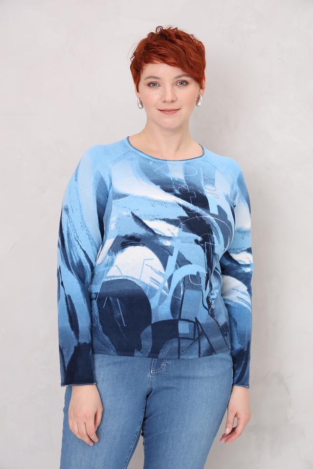 Женский пуловер Rabe collection голубого цвета с оригинальным абстрактным принтом. Изготовлен из мягкого хлопка, обеспечивающего комфорт в носке. Стильный и удобный выбор для повседневного образа. Состав: хлопок 100%