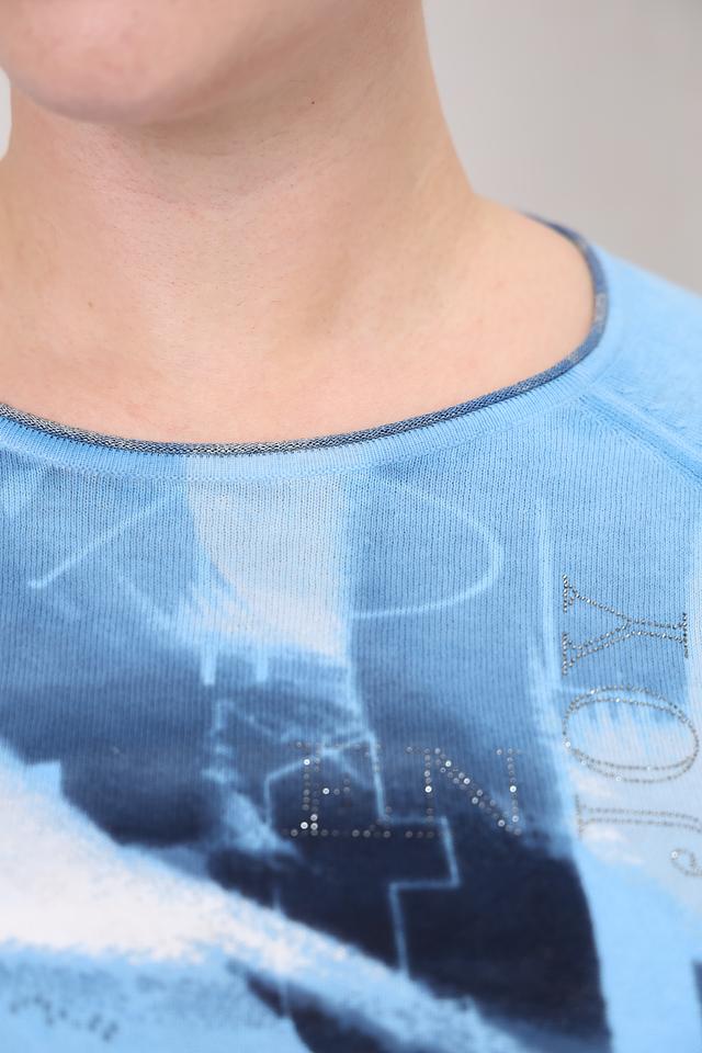 Пуловер имеет свободный крой и круглый вырез горловины. Главная особенность модели – яркий и необычный принт в голубых тонах, который придает ей индивидуальность.