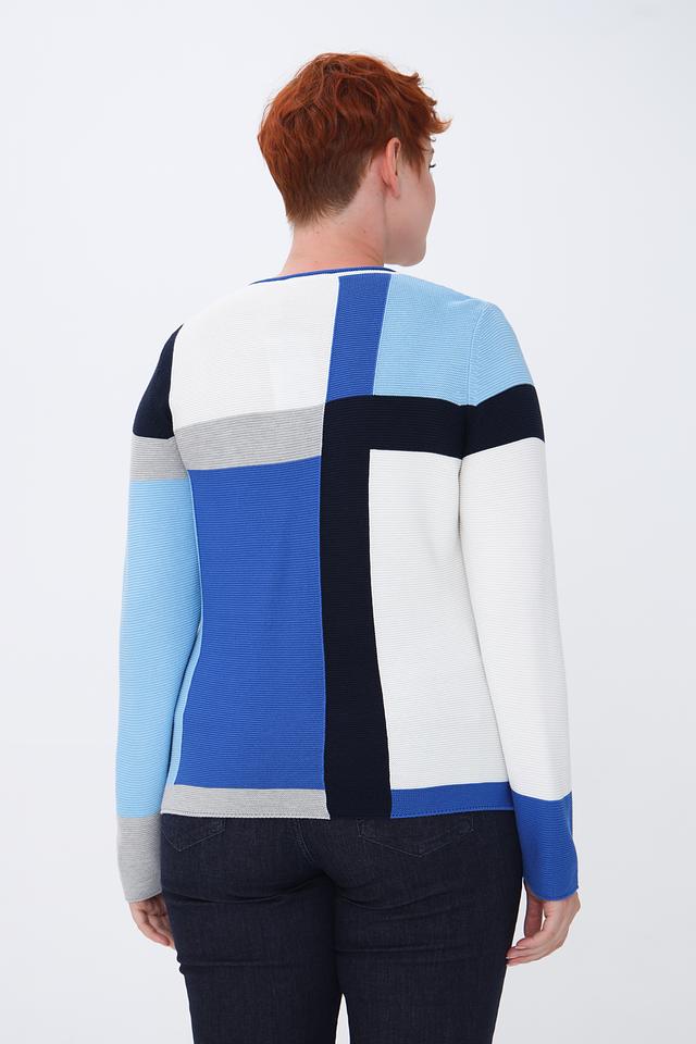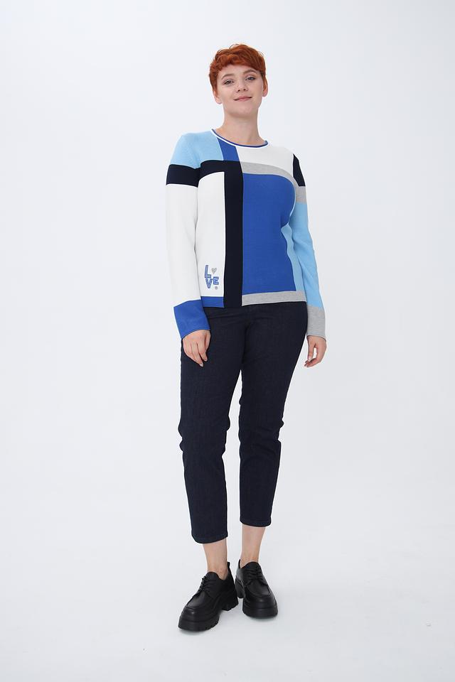 Женский пуловер Rabe collection голубого и белого цвета, выполнен в оригинальном дизайне с геометрическим узором и небольшим принтом "LOVE". Модель имеет круглый вырез горловины и комфортный крой. Состав: хлопок 50%, полиакрил 50%