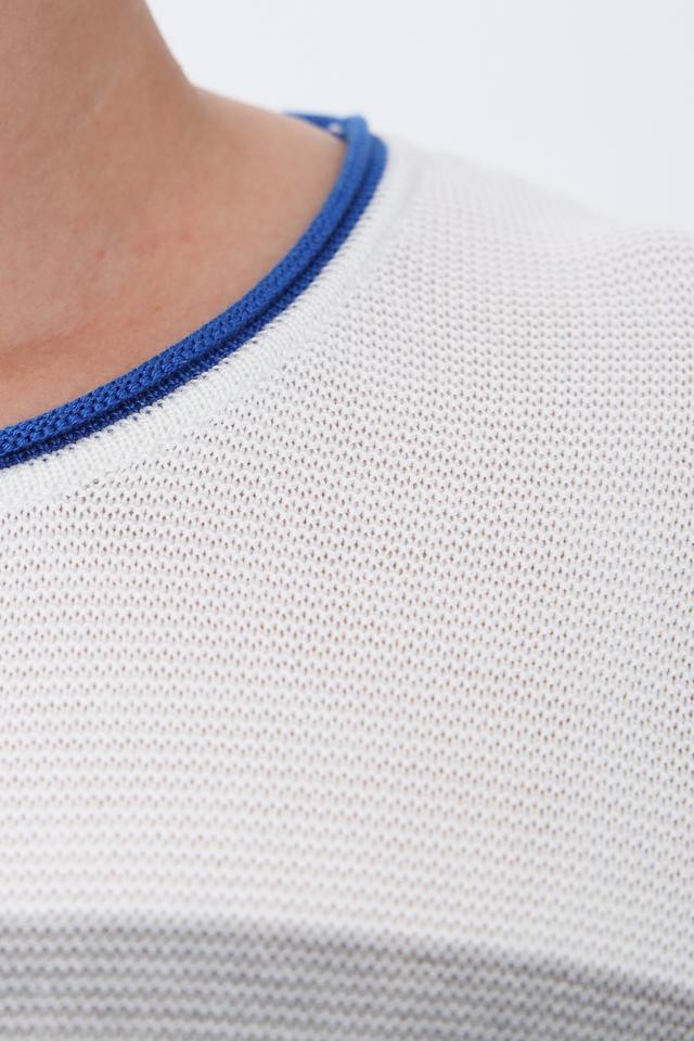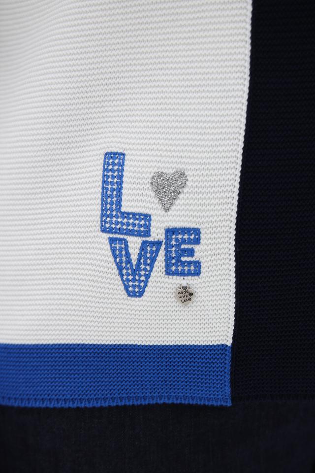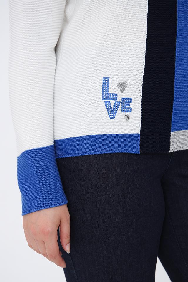 Пуловер имеет оригинальный дизайн с сочетанием различных оттенков голубого, белого и серого цветов, образующих геометрический узор в виде полос. На передней части изделия расположен небольшой, но яркий принт с надписью "LOVE".