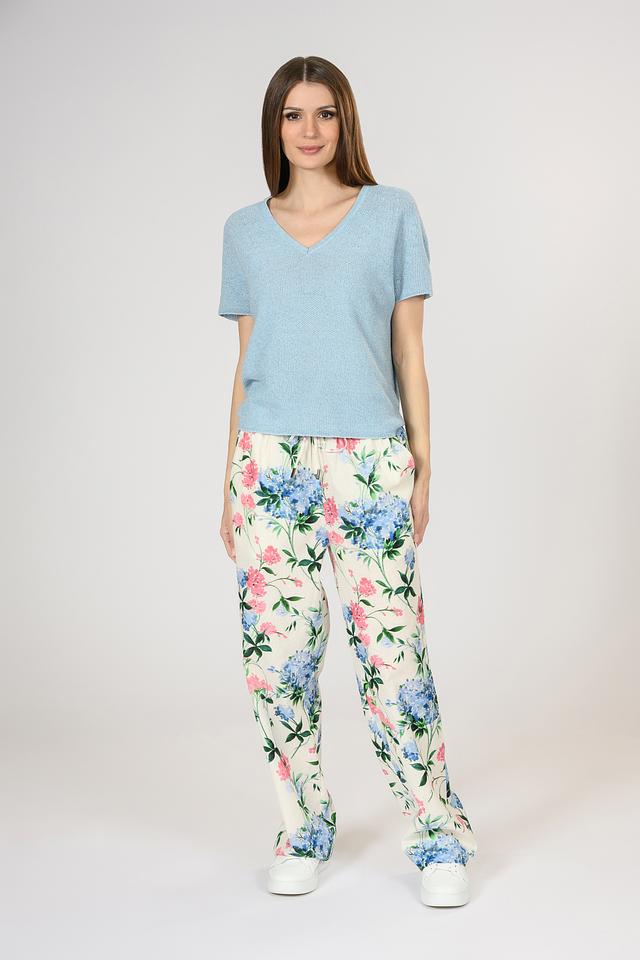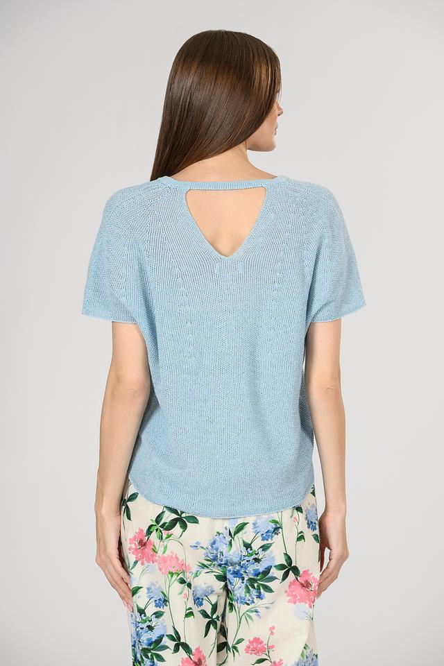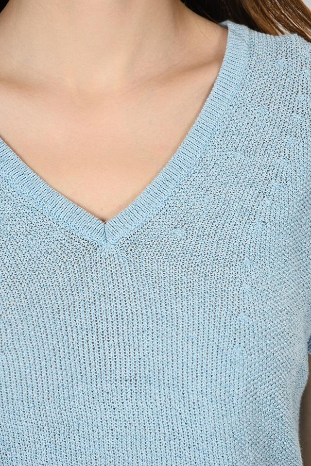 Женский пуловер Rich and Royal голубого цвета с V-образным вырезом и короткими рукавами. Изготовлен из мягкого хлопкового трикотажа, идеально подходит для создания лёгких летних образов. Состав: хлопок 85%, полиамид 11%, микрофибра 4%