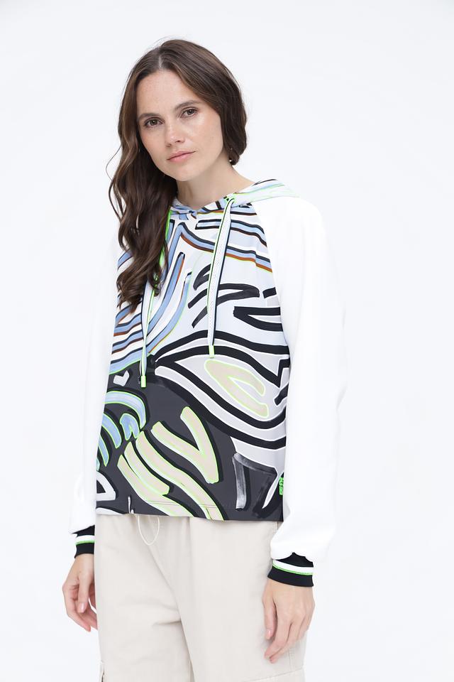 Белый пуловер Marc Cain с ярким абстрактным принтом и капюшоном станет стильным дополнением к вашему гардеробу. Модель выполнена из мягкого полиэстера с добавлением эластана для комфорта и свободы движений. Состав: полиэстер 87%, эластан 13%