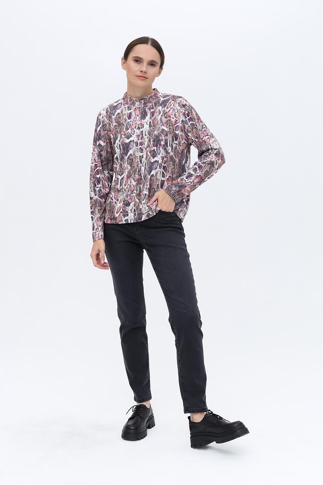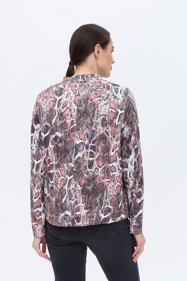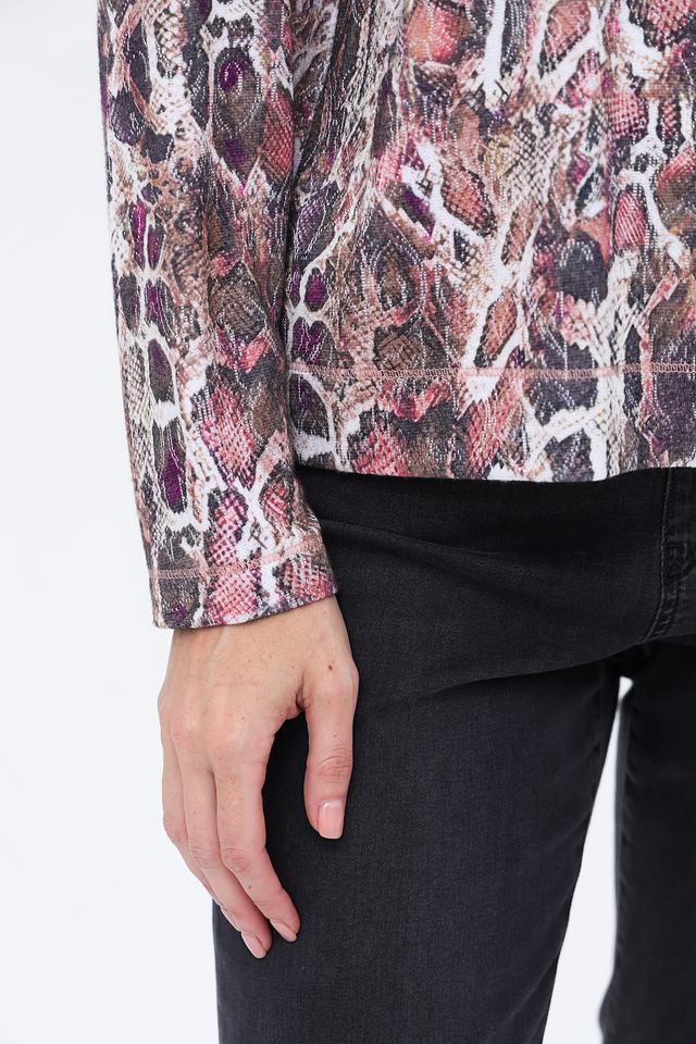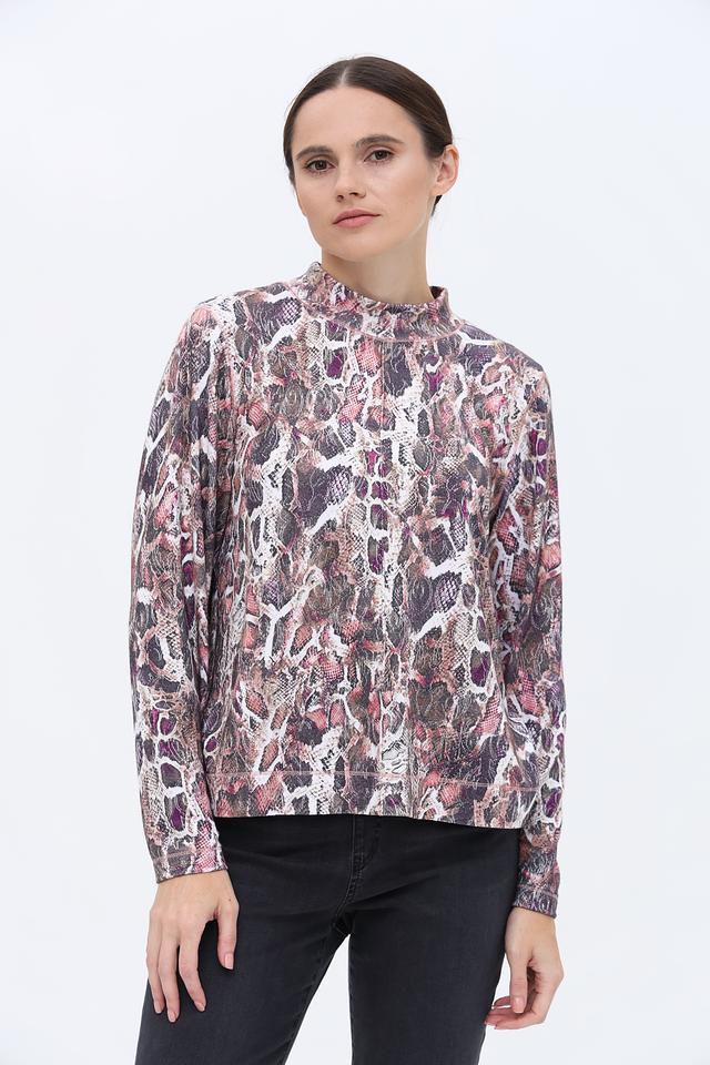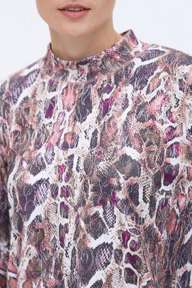 Пуловер имеет высокий воротник-стойку, который придает образу элегантность и изысканность. Основной акцент изделия – эффектный принт, имитирующий змеиную кожу, выполненный в разнообразной цветовой гамме.