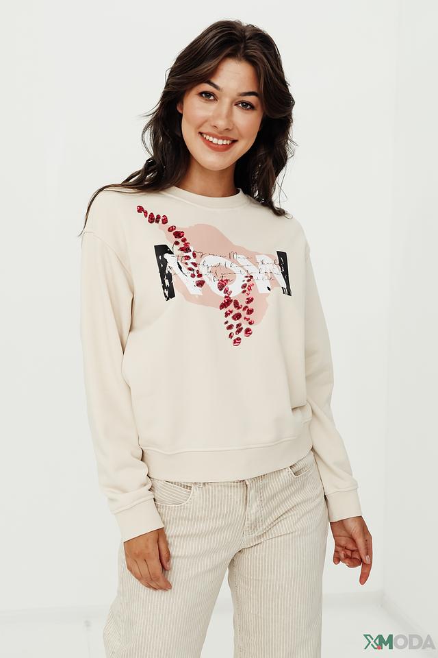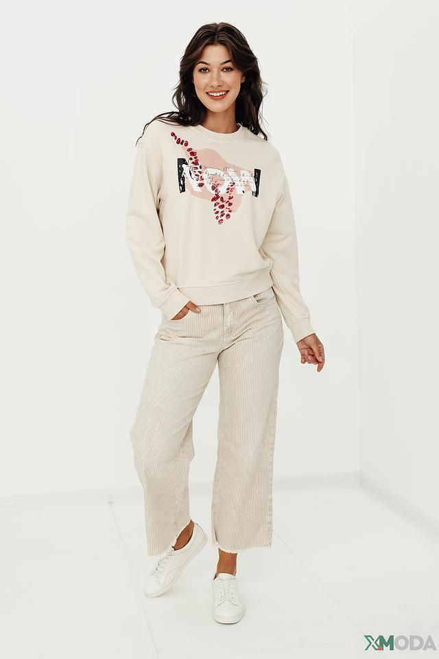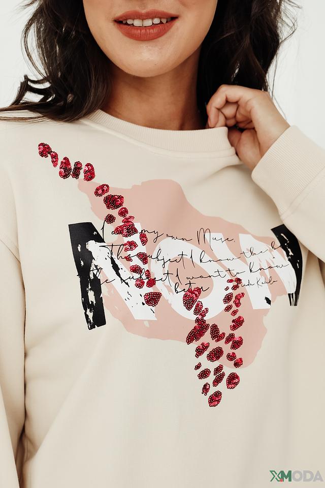 Особенностью данного пуловера является оригинальный принт с изображением сердца и надписями, выполненный в красных и черных тонах. Этот элемент декора делает модель яркой и запоминающейся.