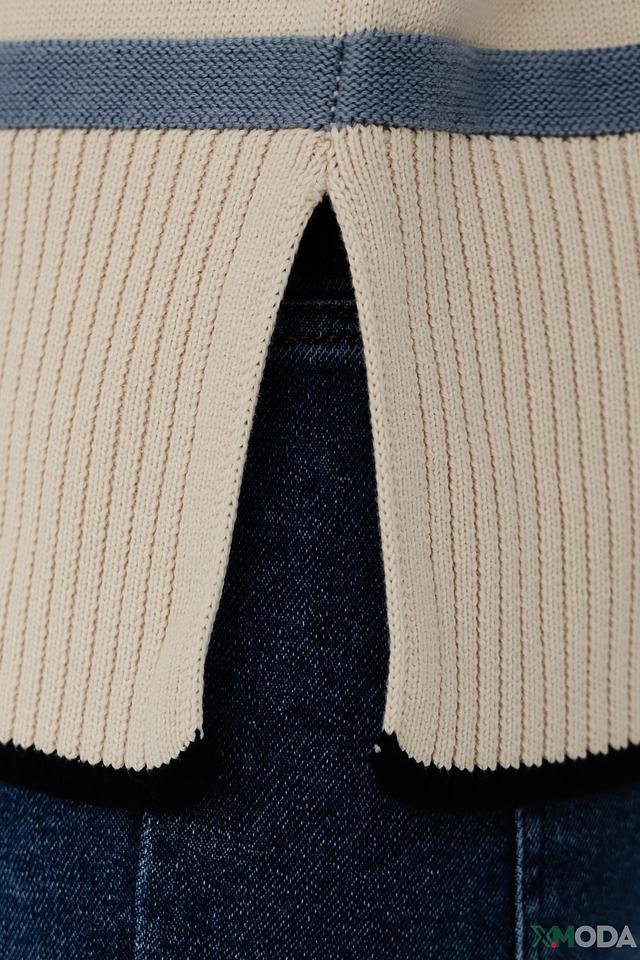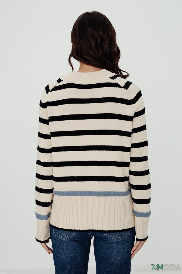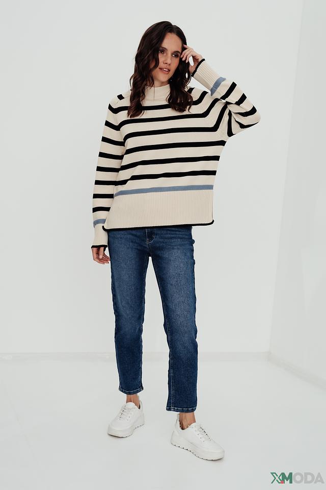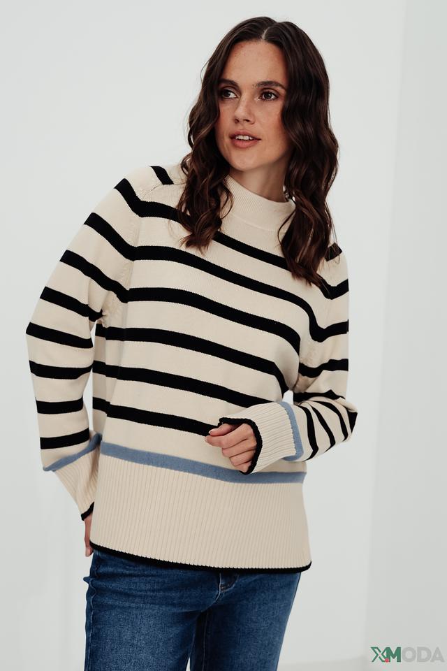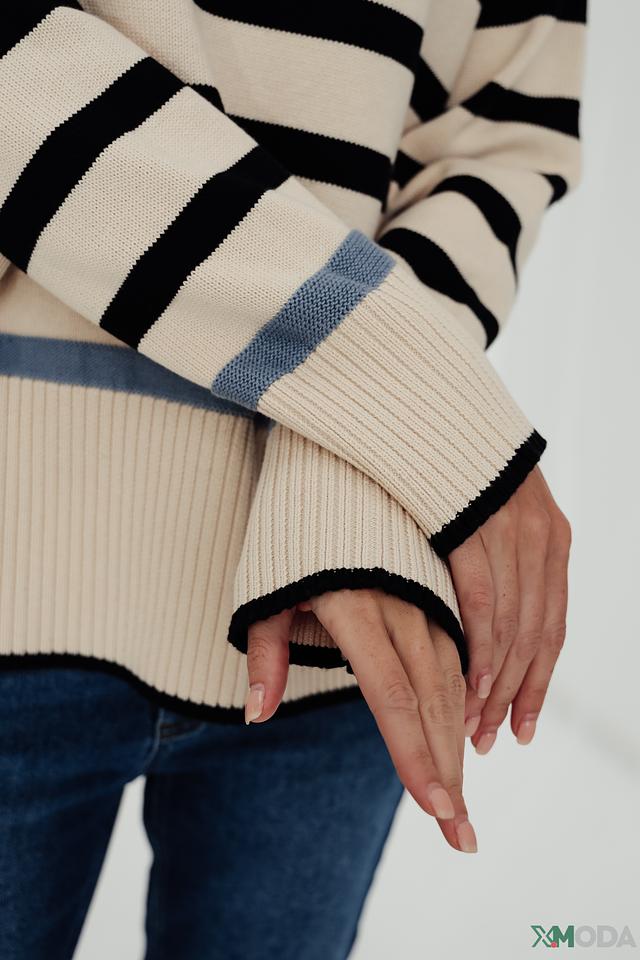 Пуловер имеет классический силуэт с округлым вырезом горловины и длинными рукавами. Его отличает яркий полосатый узор в бежевых и черных тонах, а также горизонтальная голубая полоса в нижней части изделия. Рукава и горловина отделаны черной полосой, что добавляет контрастности и завершенности образу.