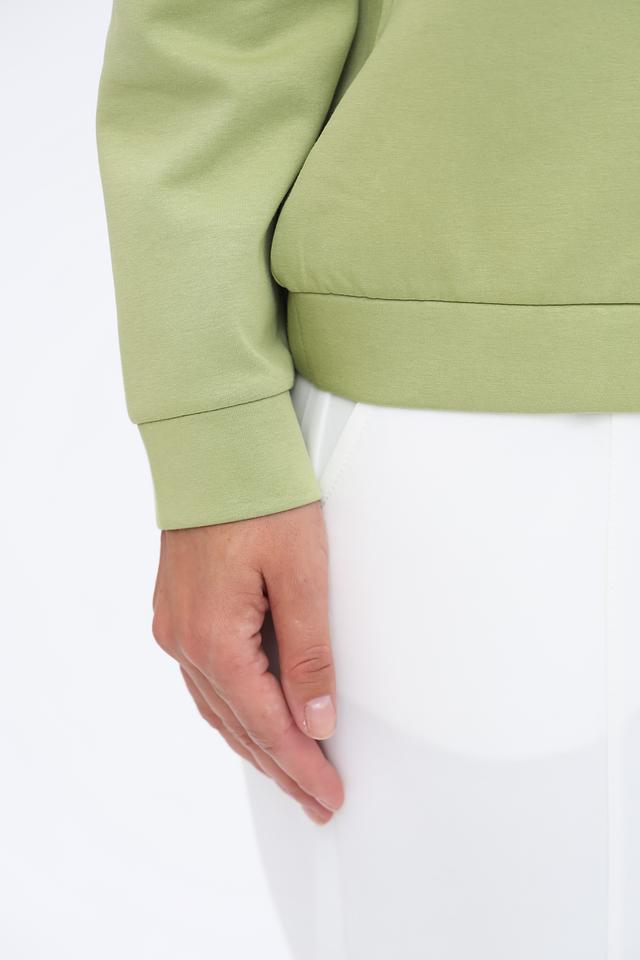Состав ткани: 50% хлопок, 45% полиэстер, 5% эластан. Хлопок обеспечивает мягкость и воздухопроницаемость, полиэстер – износостойкость и сохранение формы, а эластан – эластичность и комфорт при носке. Этот пуловер идеально подходит для создания повседневных образов.