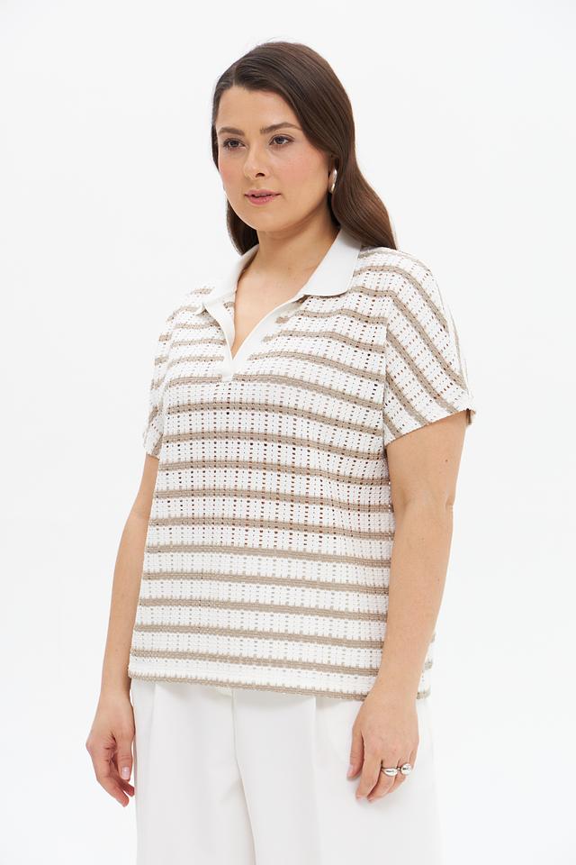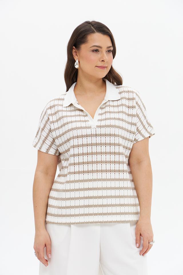 Бежевый пуловер от Tuzzi с коротким рукавом и воротником-поло в полоску. Модель выполнена из мягкого трикотажа с добавлением вискозы и эластана, обеспечивающего комфорт и свободу движений. Состав: полиэстер 61%, вискоза 34%, эластан 5%