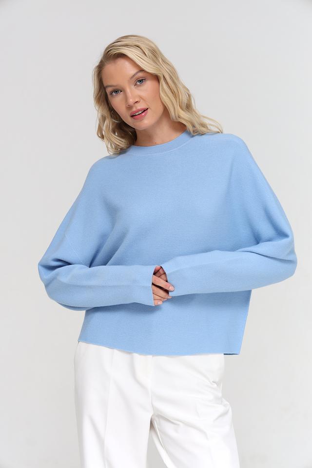 Пуловер имеет свободный, слегка заниженный крой, который обеспечивает свободу движений и комфортную посадку по фигуре. Круглый вырез горловины делает его универсальным и подходящим для различных стилей. Голубой цвет пуловера освежает образ и легко сочетается с другими цветами в вашем гардеробе.