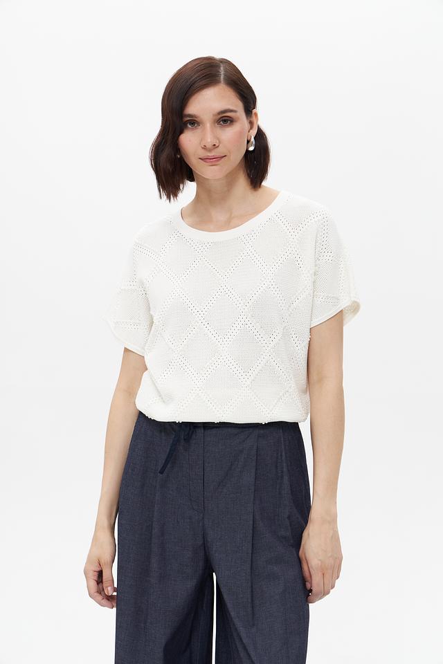 Белый пуловер от UNQ с короткими рукавами и ажурной вязкой. Изготовлен из 100% хлопка, обеспечивающего комфорт и воздухопроницаемость. Идеальный выбор для создания лёгкого и стильного образа. Состав: хлопок 100%