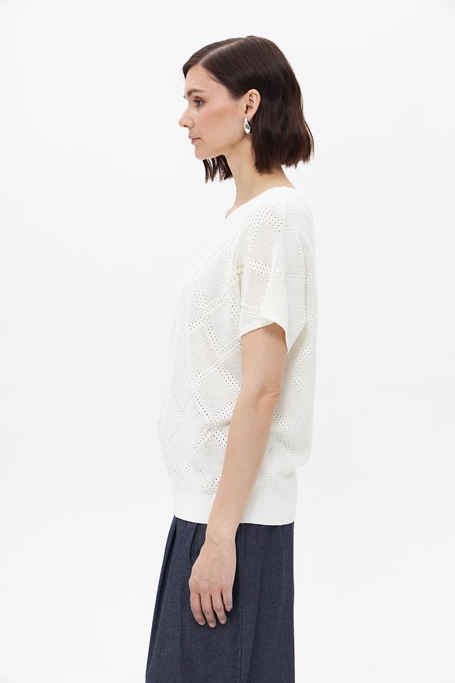 Особенностью модели является ажурная вязка, которая придает ей лёгкость и изысканность. Короткие рукава делают пуловер идеальным для тёплой погоды.
