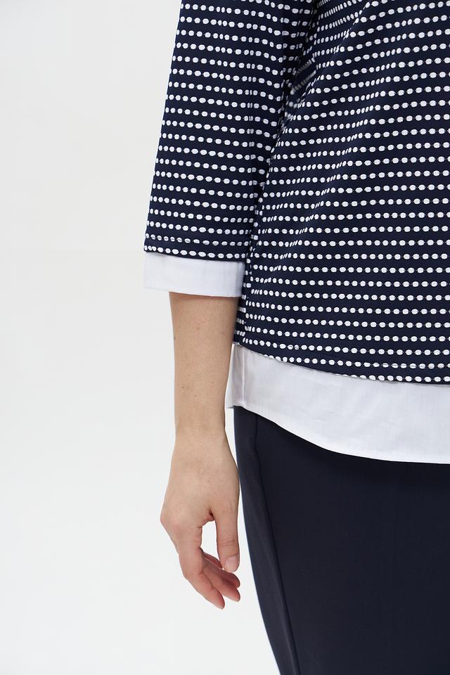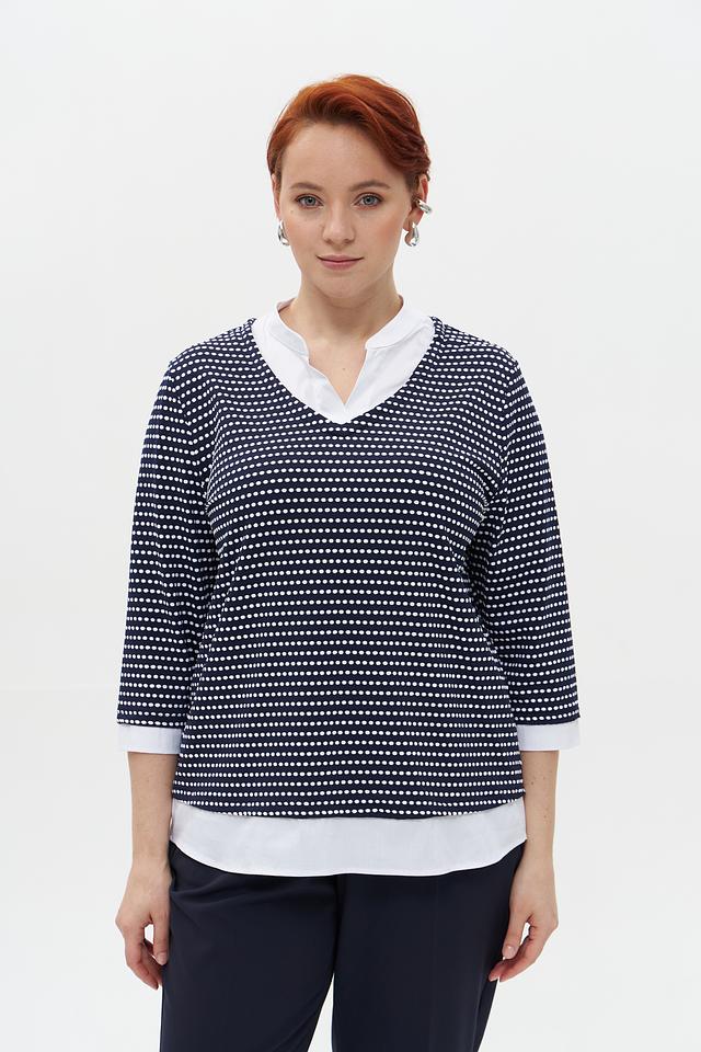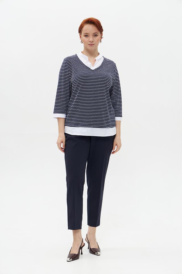Женский пуловер Frank Walder темно-синего цвета с белым рисунком в полоску. Модель с V-образным вырезом и рукавом 3/4, выполненная из мягкого и приятного к телу трикотажа. Состав: полиамид 95%, эластан 5%