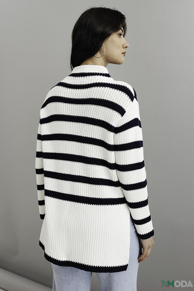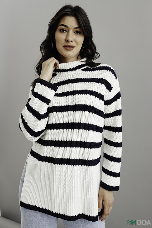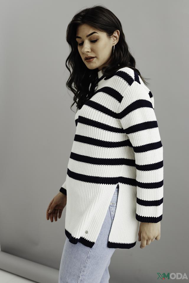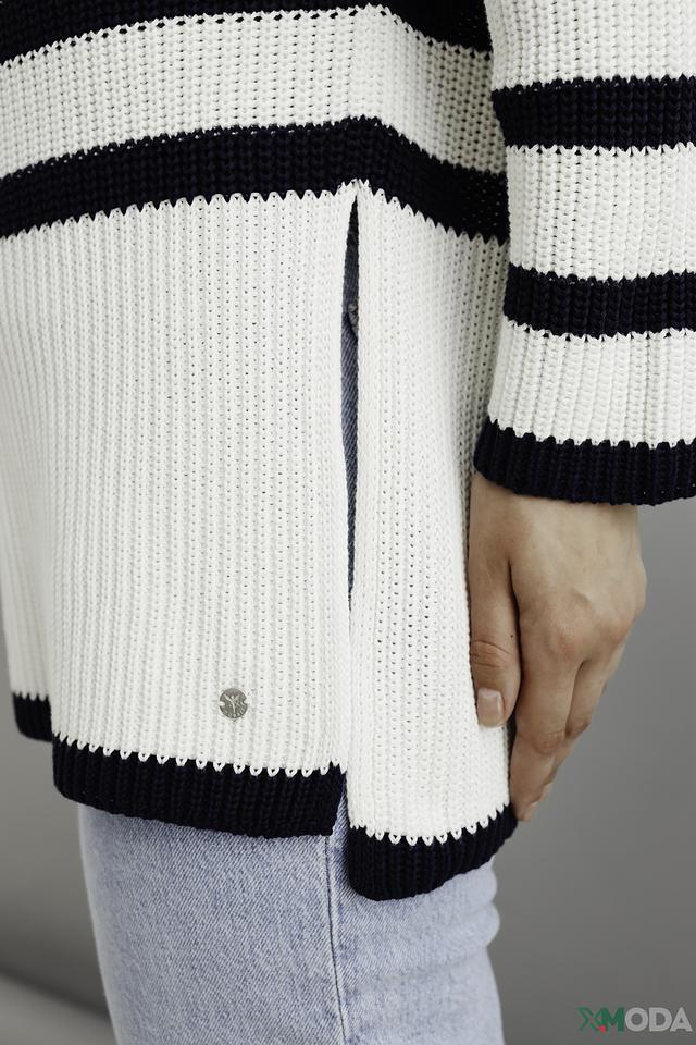 Женский пуловер Monari белого и тёмно-синего цвета в горизонтальную полоску. Модель выполнена из мягкого хлопка, имеет свободный крой и боковые разрезы. Идеальный выбор для создания комфортного и стильного образа. Состав: хлопок 100%