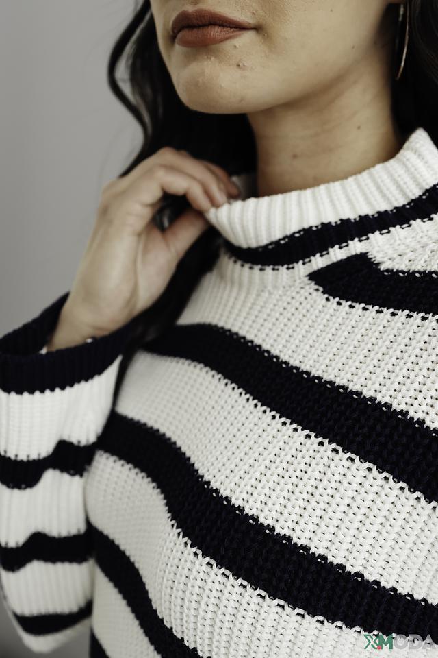 Пуловер имеет классический прямой крой, который подходит для любой фигуры. Горизонтальная полоска в бело-синей гамме придает изделию свежий и современный вид. Модель дополнена боковыми разрезами, которые добавляют динамики и позволяют создавать интересные сочетания с другой одеждой.