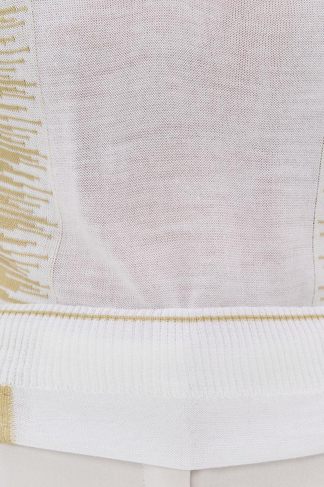 Пуловер имеет оливковый цвет и свободный крой, который не сковывает движения. Короткие рукава делают его идеальным для теплой погоды. Оригинальной деталью является бахрома, расположенная по переду изделия, что придает ему особый шарм и индивидуальность.