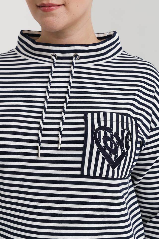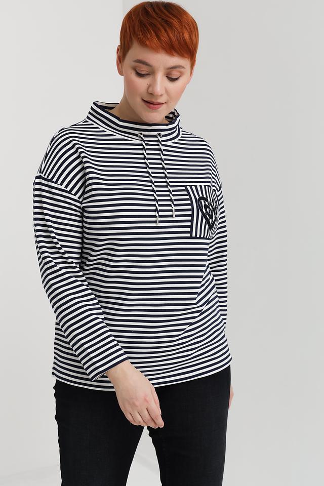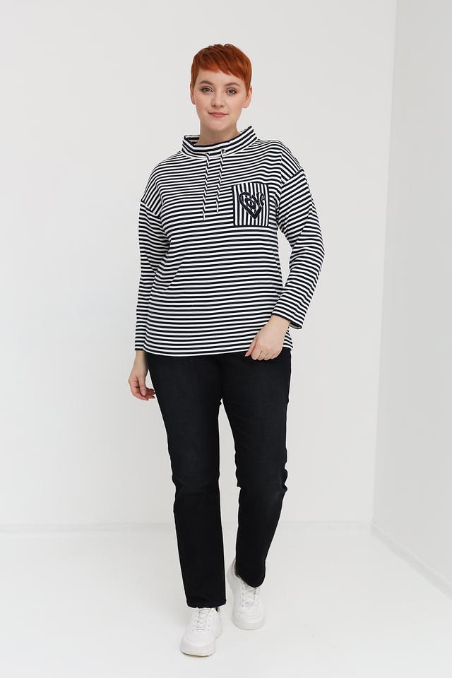 Женский пуловер Via Appia чёрно-белого цвета с полоской и оригинальным карманом в виде сердца. Модель с высоким воротом и шнурком, выполненная из мягкой вискозы с добавлением полиэстера и эластана. Состав: вискоза 57%, полиэстер 41%, эластан 2%