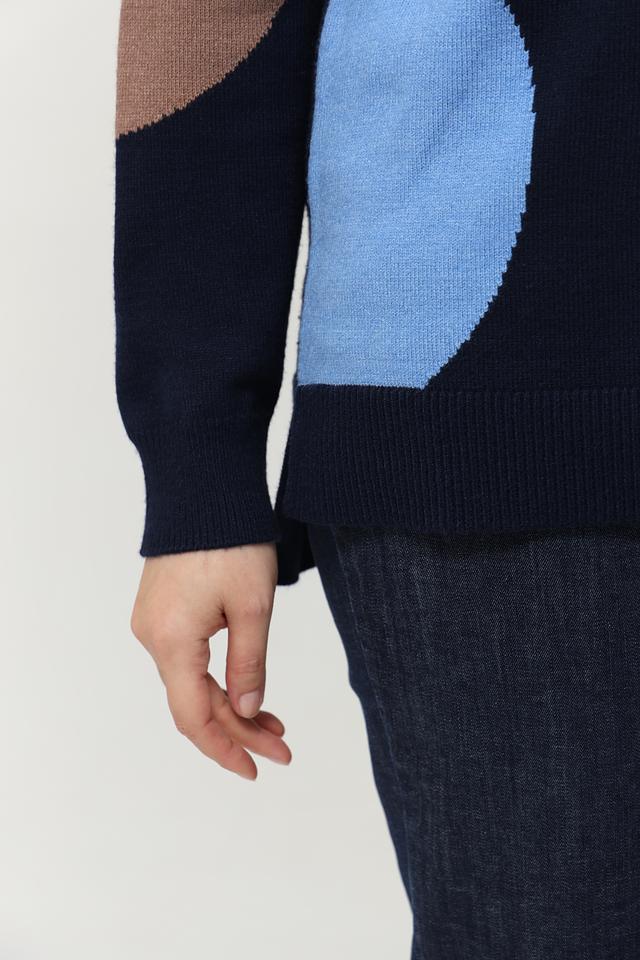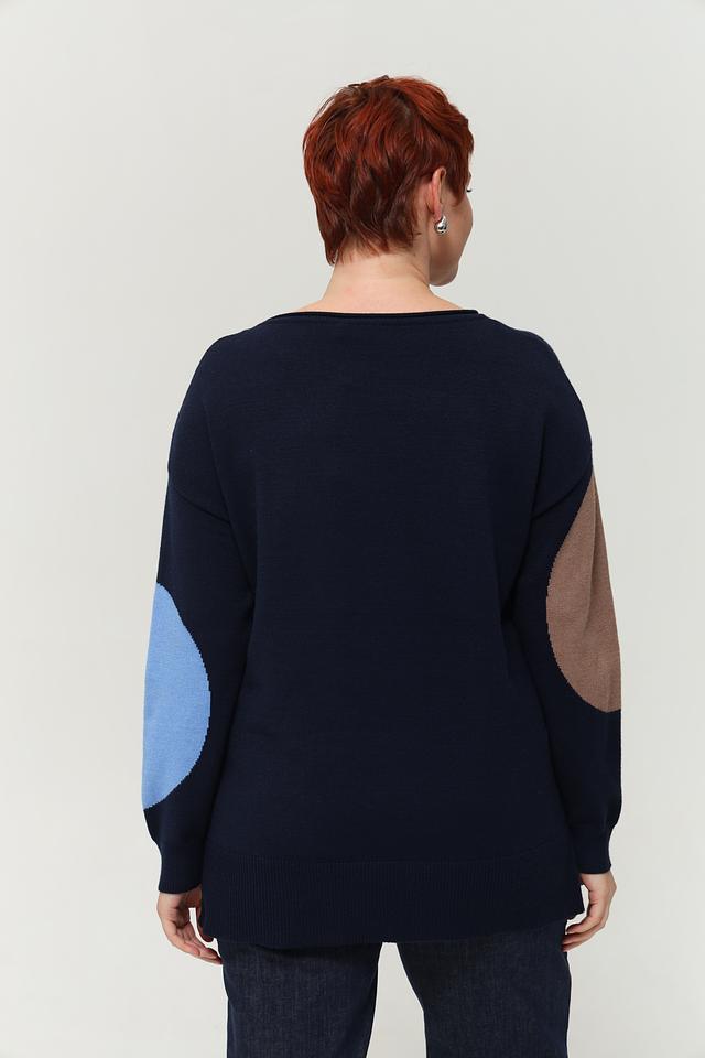 Этот стильный пуловер от Via Appia выполнен в насыщенном синем цвете и украшен крупными геометрическими фигурами – кругами различных оттенков: белого, голубого и коричневого. Дизайн пуловера делает его уникальным и привлекательным.