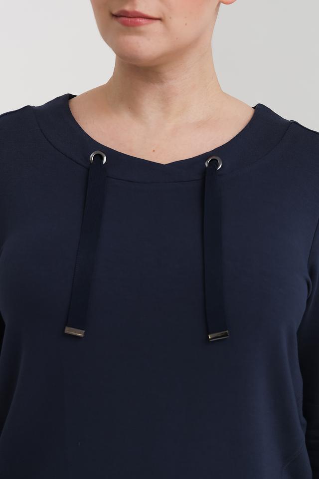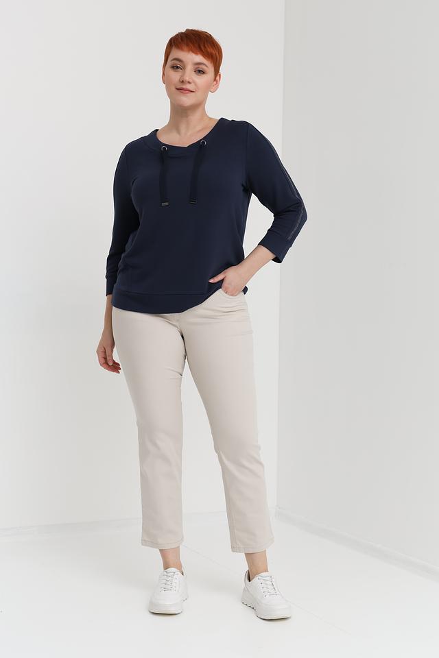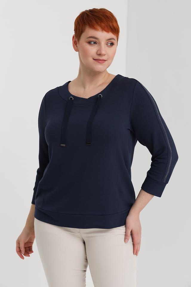 Синий пуловер Via Appia с рукавами 3/4 и декоративными шнурками на вырезе – стильное и комфортное решение для повседневного образа. Изготовлен из мягкой вискозы с добавлением полиэстера и эластана, обеспечивающих приятные тактильные ощущения и хорошую посадку. Состав: вискоза 59%, полиэстер 36%, эластан 5%