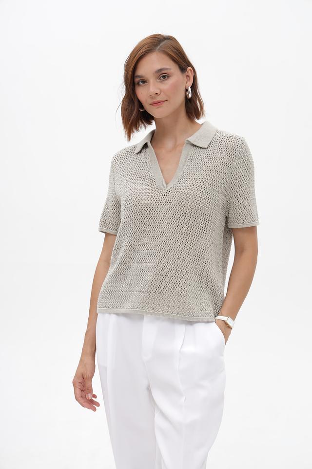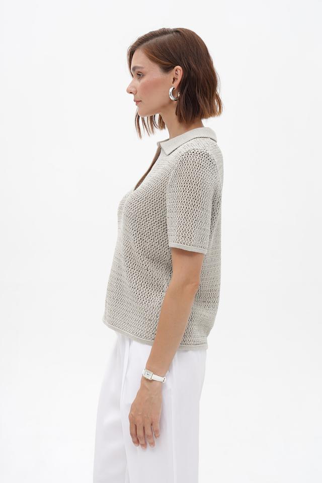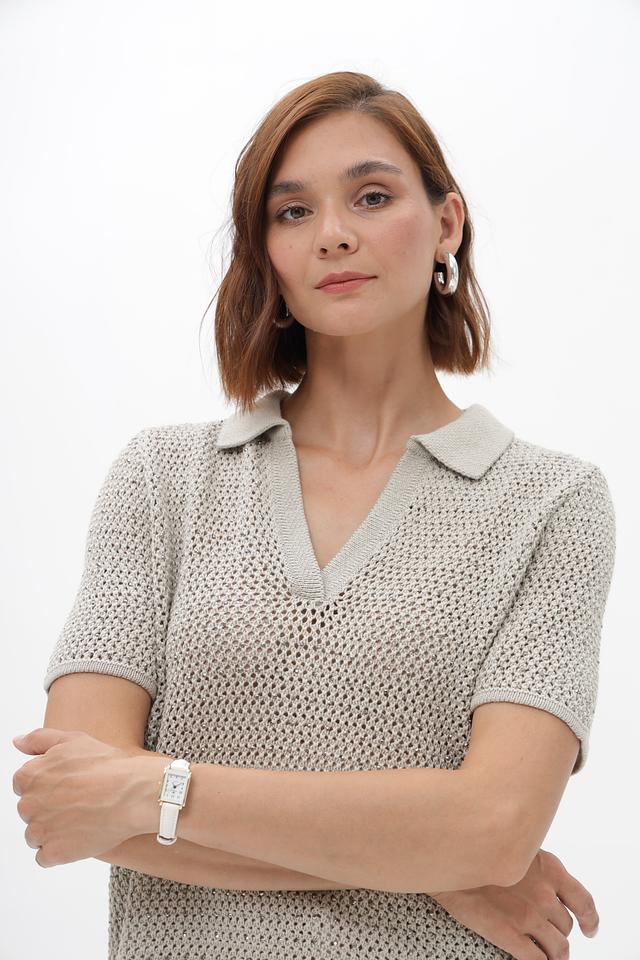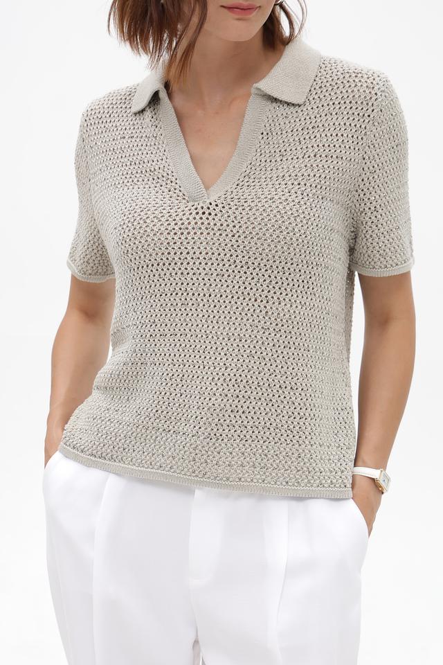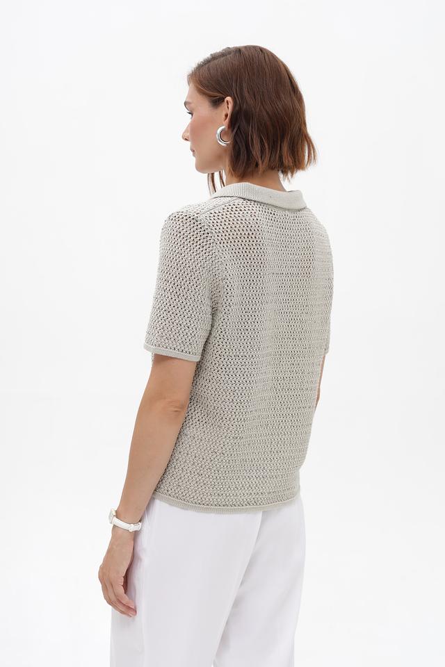 Модель имеет короткие рукава и классический воротник-поло, что придает ей элегантный и современный вид. Ажурная вязка добавляет легкости и оригинальности образу.