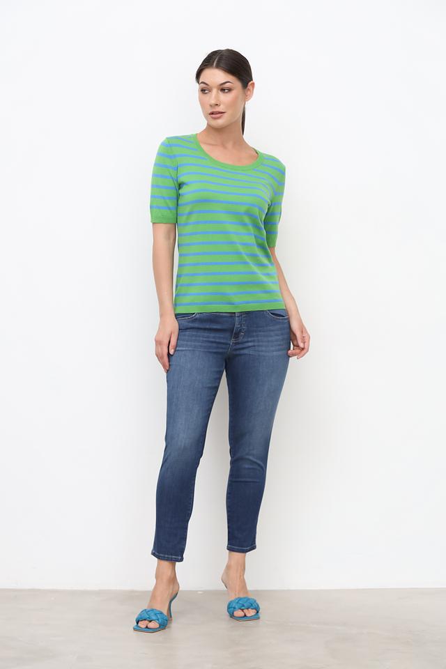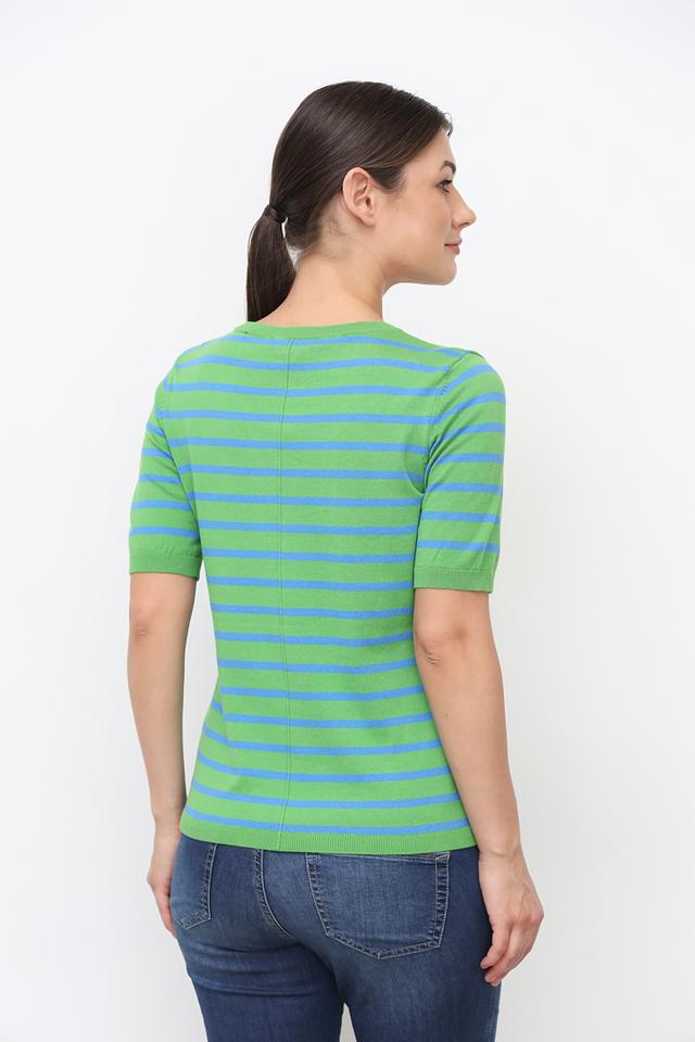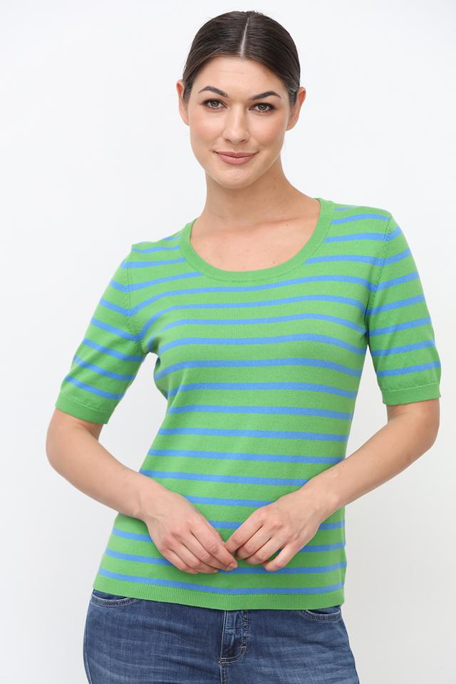 Женский пуловер Oui зеленого и голубого цвета с коротким рукавом и круглым вырезом. Модель выполнена в горизонтальную полоску, что придает ей стильный и современный вид. Изготовлен из мягкого хлопка с добавлением полиамида. Состав: хлопок 80%, полиамид 20%