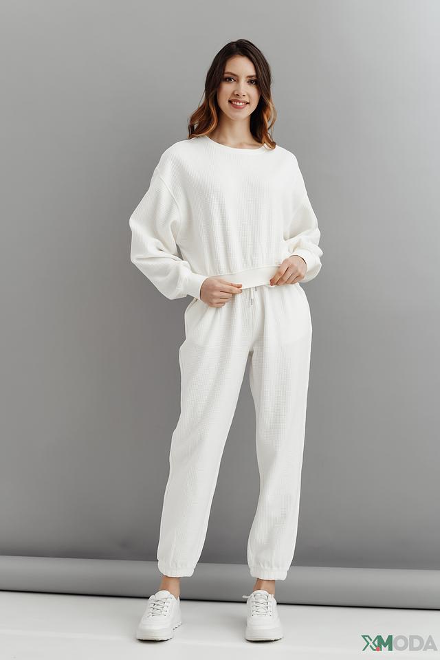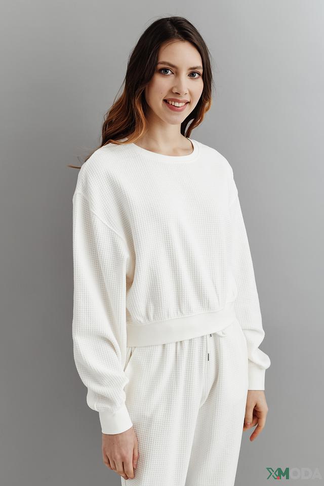 Модель имеет свободный крой, который не сковывает движения, и круглый вырез горловины. Текстура ткани "вафля" придает пуловеру оригинальность и стильный вид.