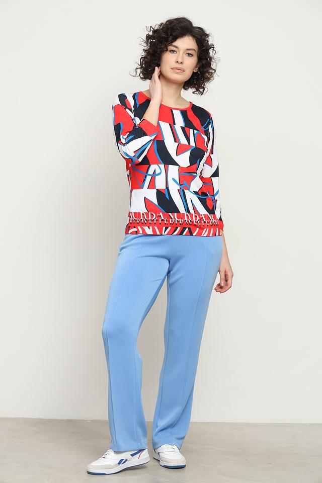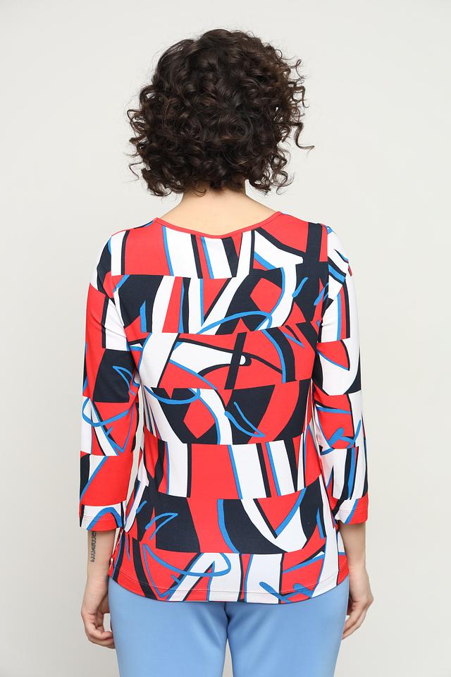 Блуза имеет прямой крой, круглый вырез горловины и рукав длиной 3/4. Главная особенность модели – эффектный абстрактный принт, сочетающий в себе красный, белый и синий цвета. Такой рисунок делает блузу уникальной и привлекательной.