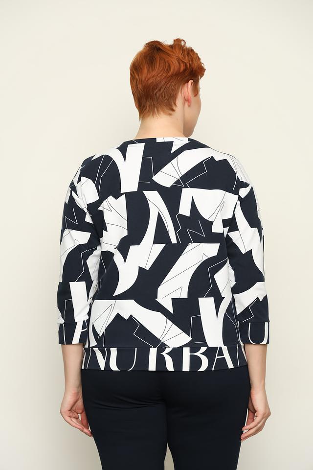 Блуза имеет свободный крой, который не сковывает движений, и короткий рукав, идеально подходящий для теплой погоды. Главной особенностью модели является яркий геометрический принт в чёрно-белой гамме, который придаёт ей современный и стильный вид.
