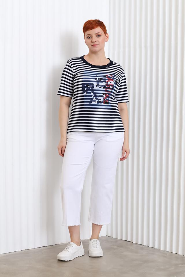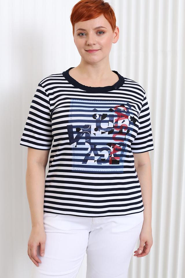 Женская футболка Rabe collection сине-белого цвета с ярким принтом. Модель выполнена из 100% хлопка, обеспечивая комфорт и удобство в носке. Стильный дизайн с полоской и оригинальным рисунком. Состав: хлопок 100%