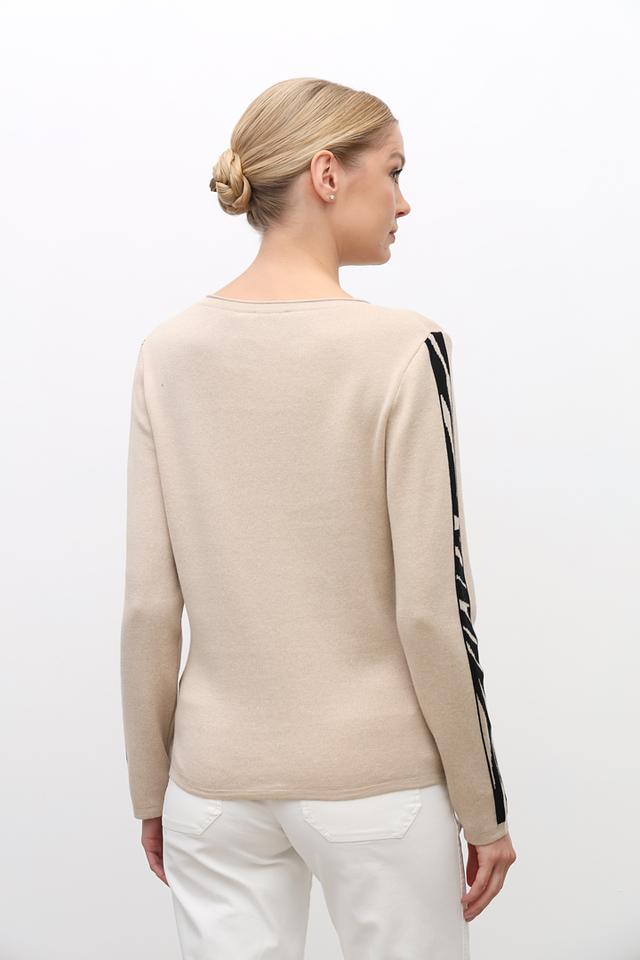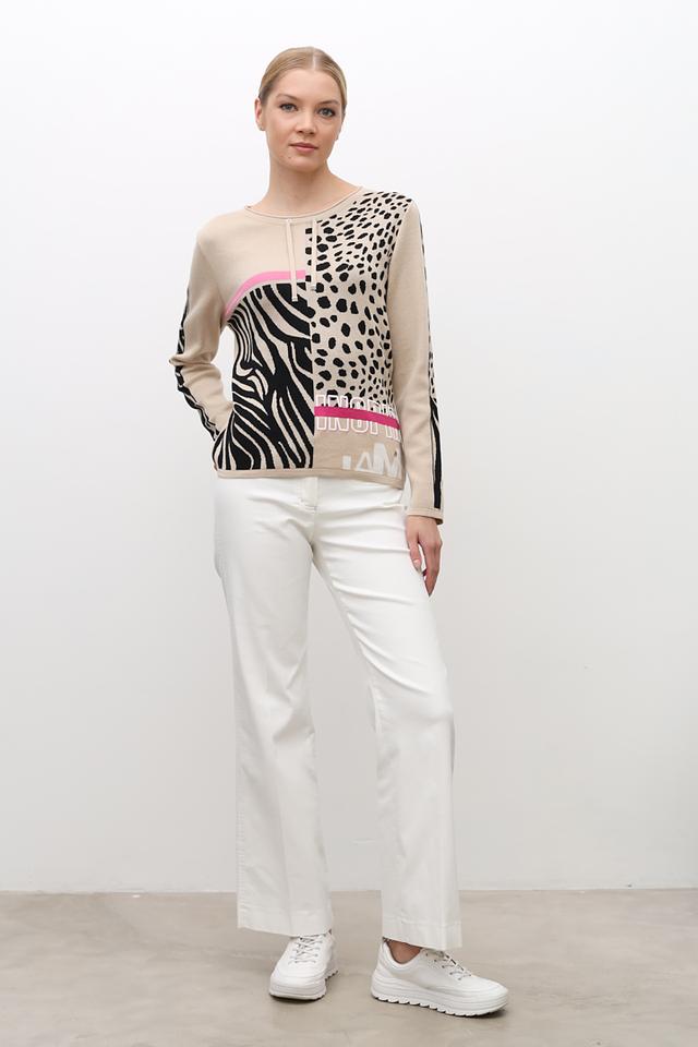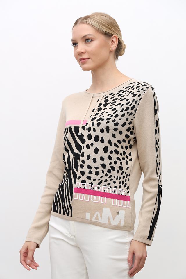 Этот стильный пуловер от Rabe collection станет прекрасным дополнением к вашему гардеробу. Пуловер выполнен в бежевом цвете и украшен ярким принтом, сочетающим в себе элементы леопарда, зебры и абстрактные полосы.