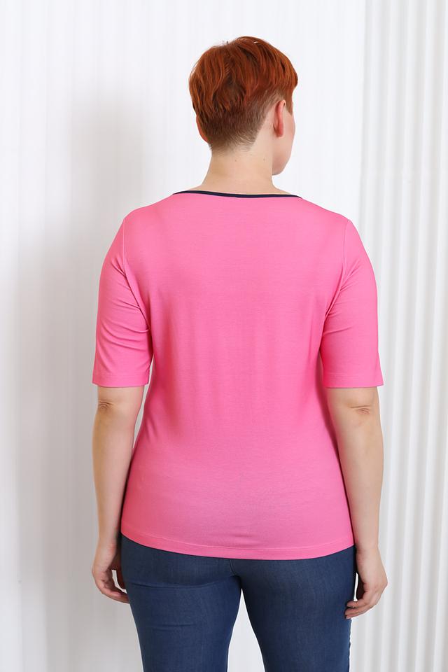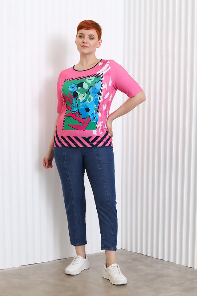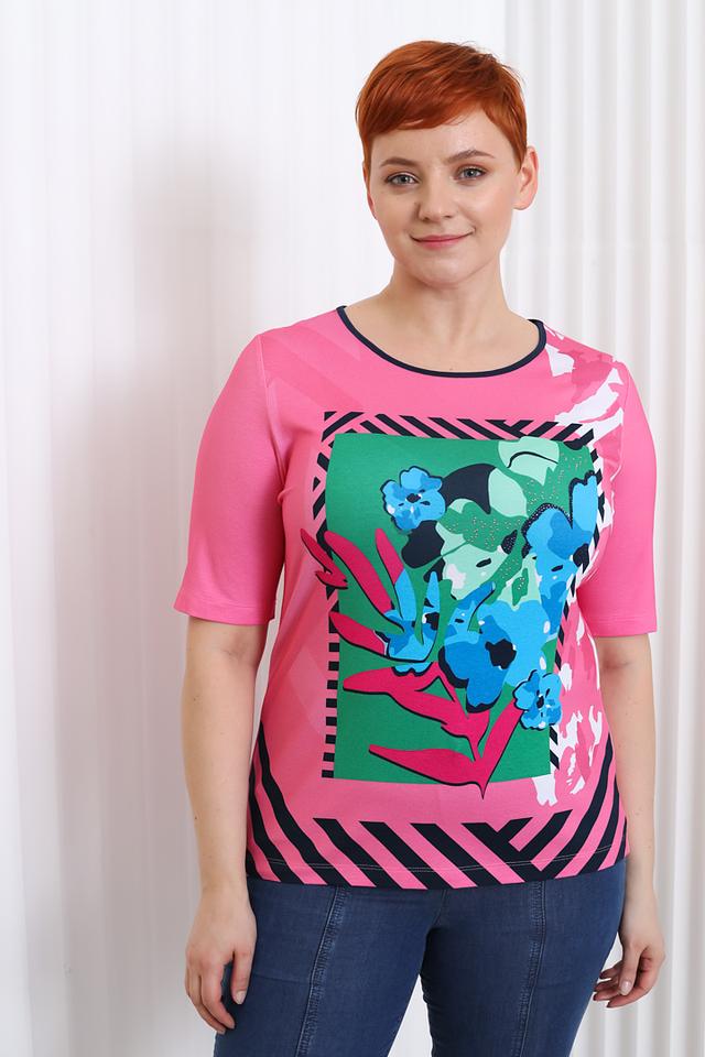 Основной цвет футболки – розовый. Передняя часть украшена оригинальным принтом с изображением ярких цветов на фоне геометрических фигур. Воротник и короткие рукава оформлены тёмно-синей окантовкой, что добавляет контрастности и завершенности образу.