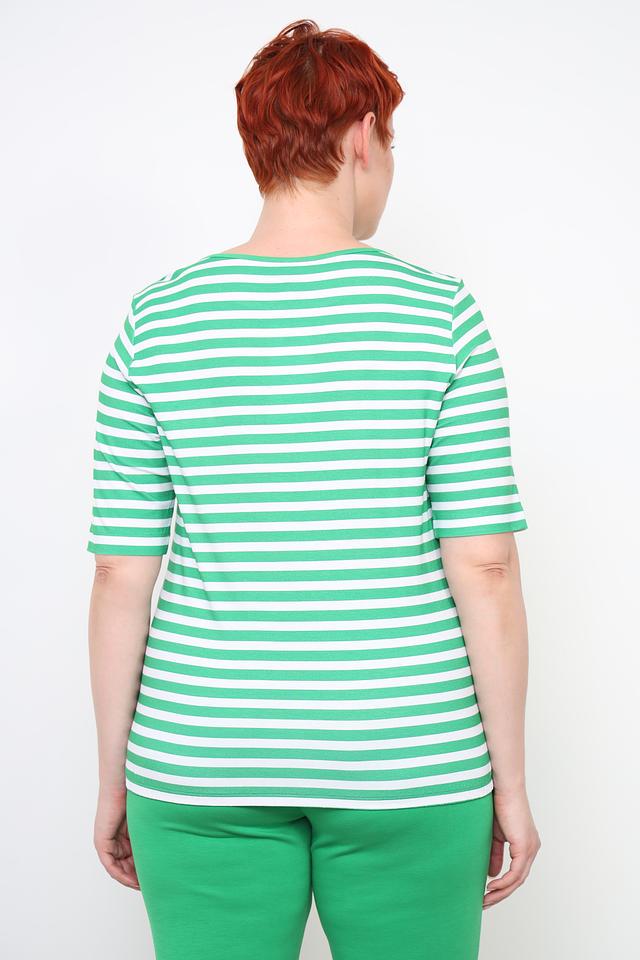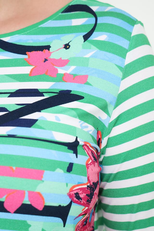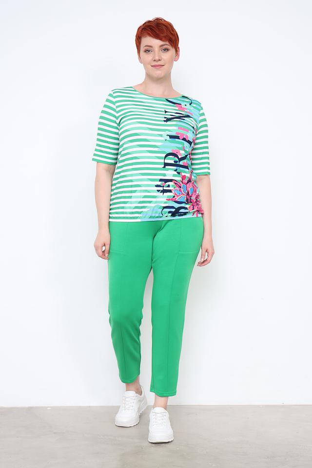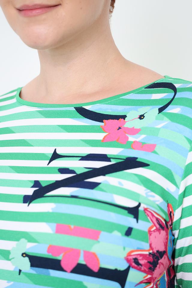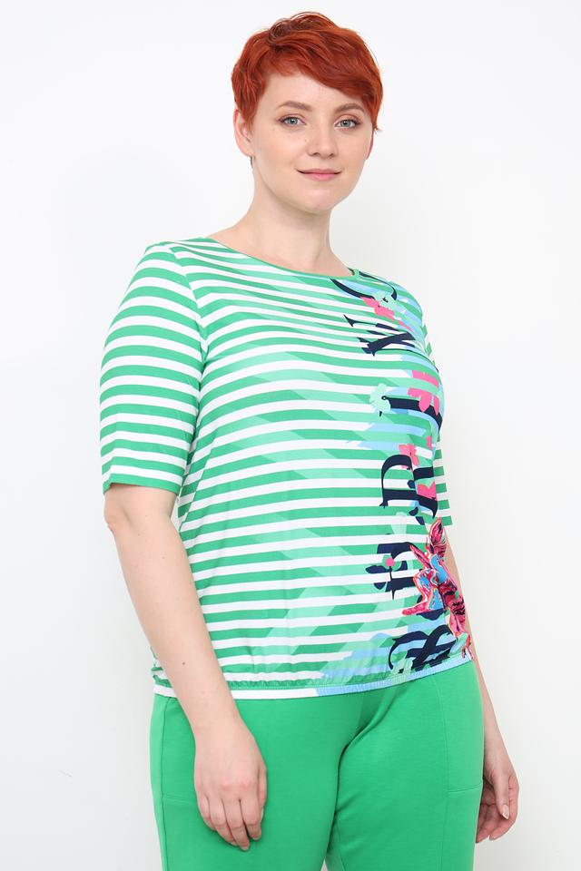 Женская футболка Rabe collection зеленого цвета с ярким цветочным принтом и классическим полосатым дизайном. Изготовлена из мягкой вискозы с добавлением эластана для комфорта и хорошей посадки. Состав: вискоза 96%, эластан 4%