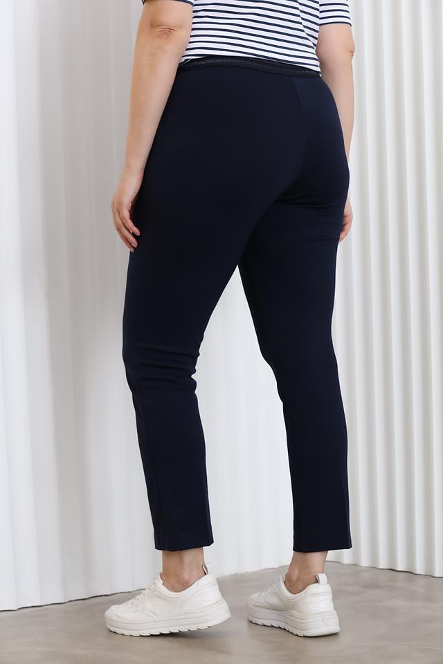 Брюки имеют прямой крой и стандартную посадку по фигуре. Эластичный пояс обеспечивает надежную фиксацию и комфорт при носке. Ткань, из которой изготовлены брюки, состоит из вискозы, полиамида и эластана, что придает им мягкость, прочность и эластичность.